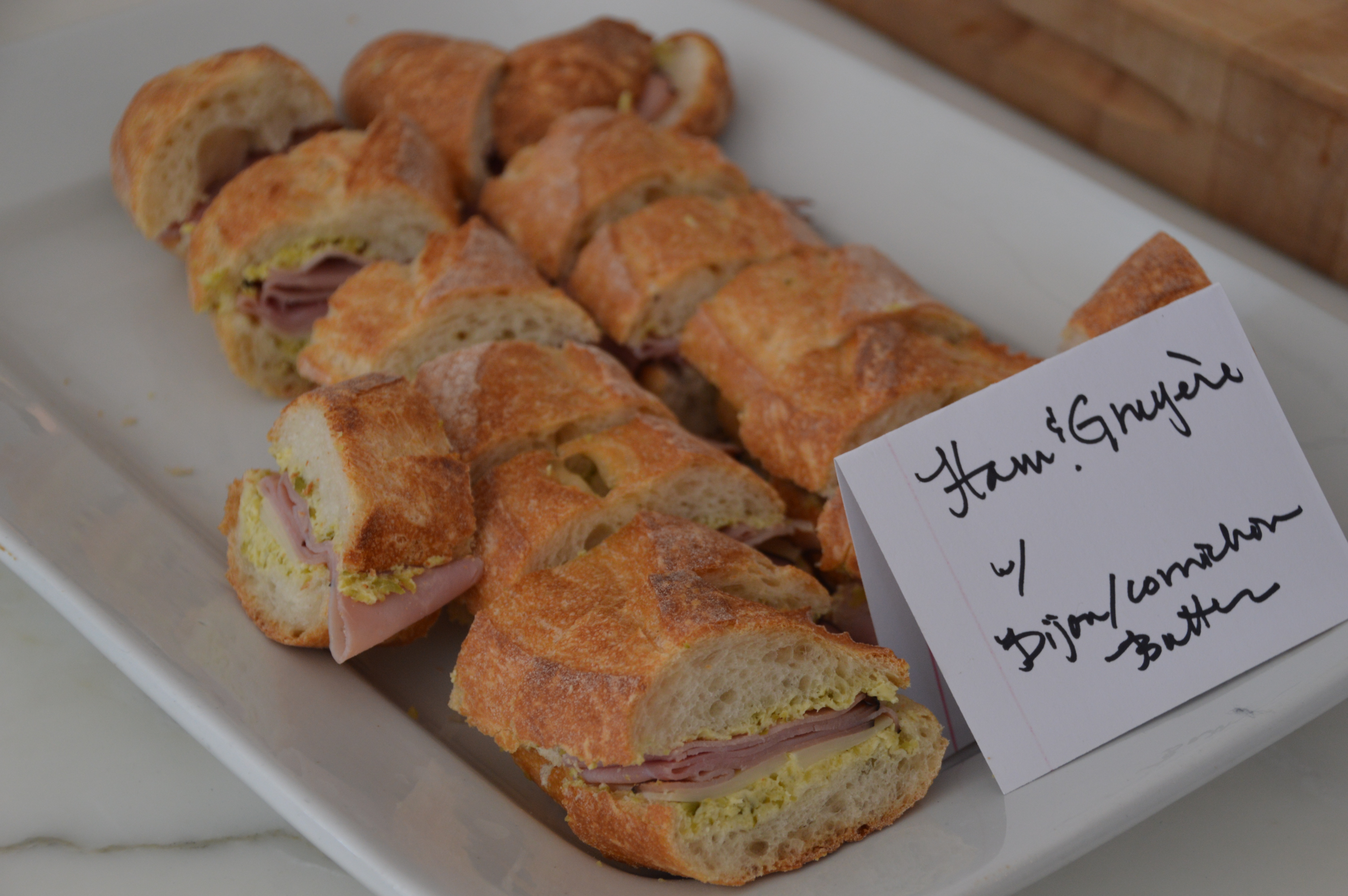 These were a last-minute add-on, but they disappeared. To make dijon/cornichon butter, add equal parts dijon mustard, softened butter and dill gherkins to a food processor and pulse to form a paste. Spread onto fresh baguette and top with thinly sliced ham and gruyere cheese.These little sandwiches were a last-minute add-on, but they disappeared. To make dijon/cornichon butter, add equal parts dijon mustard, softened butter and cornichons or dill gherkins or  to a food processor and pulse to form a paste. Spread onto fresh baguette and top with thinly sliced ham and gruyère cheese.)