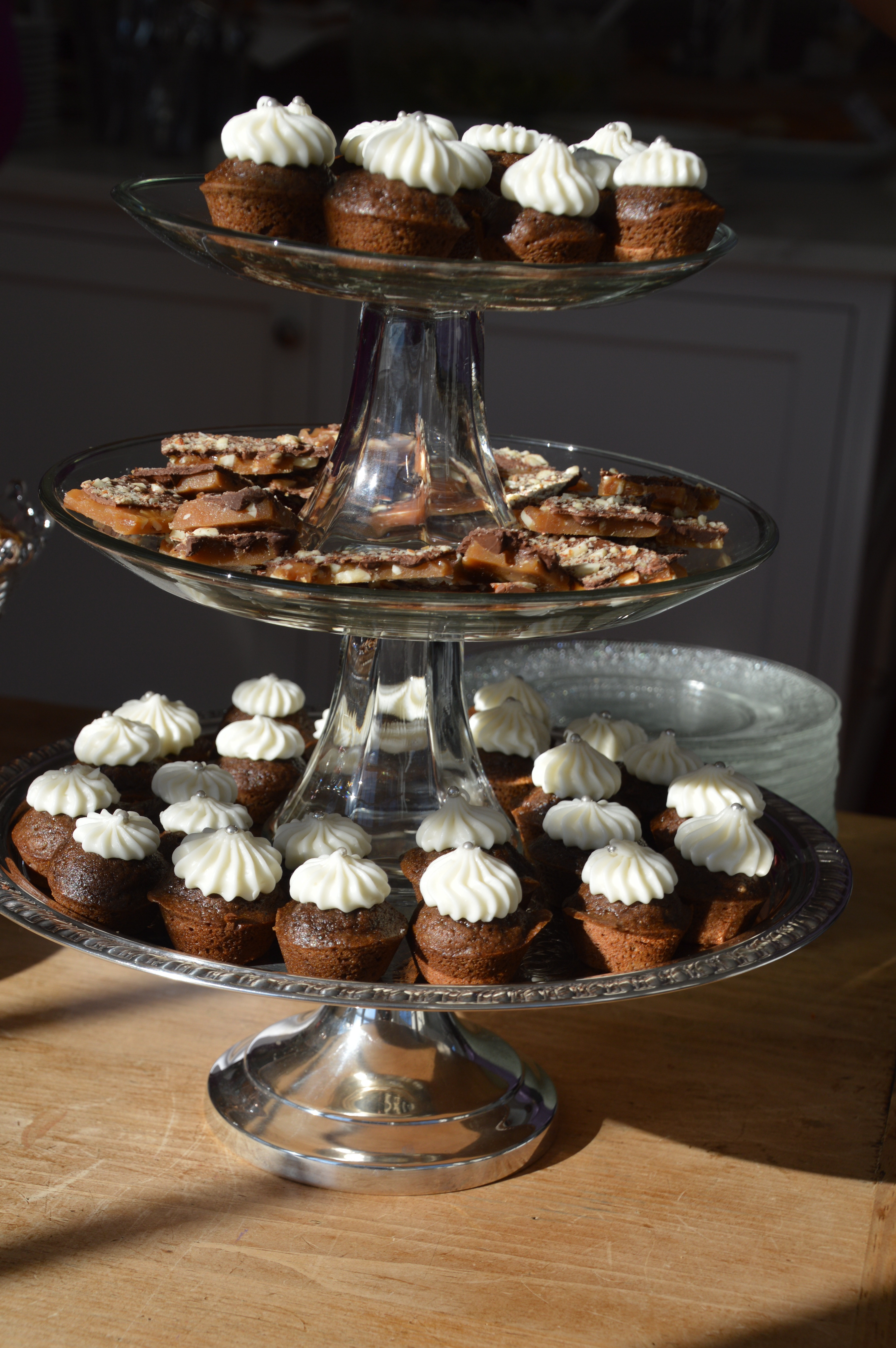 Tower of mini gingerbread cupcakes and almond toffee.