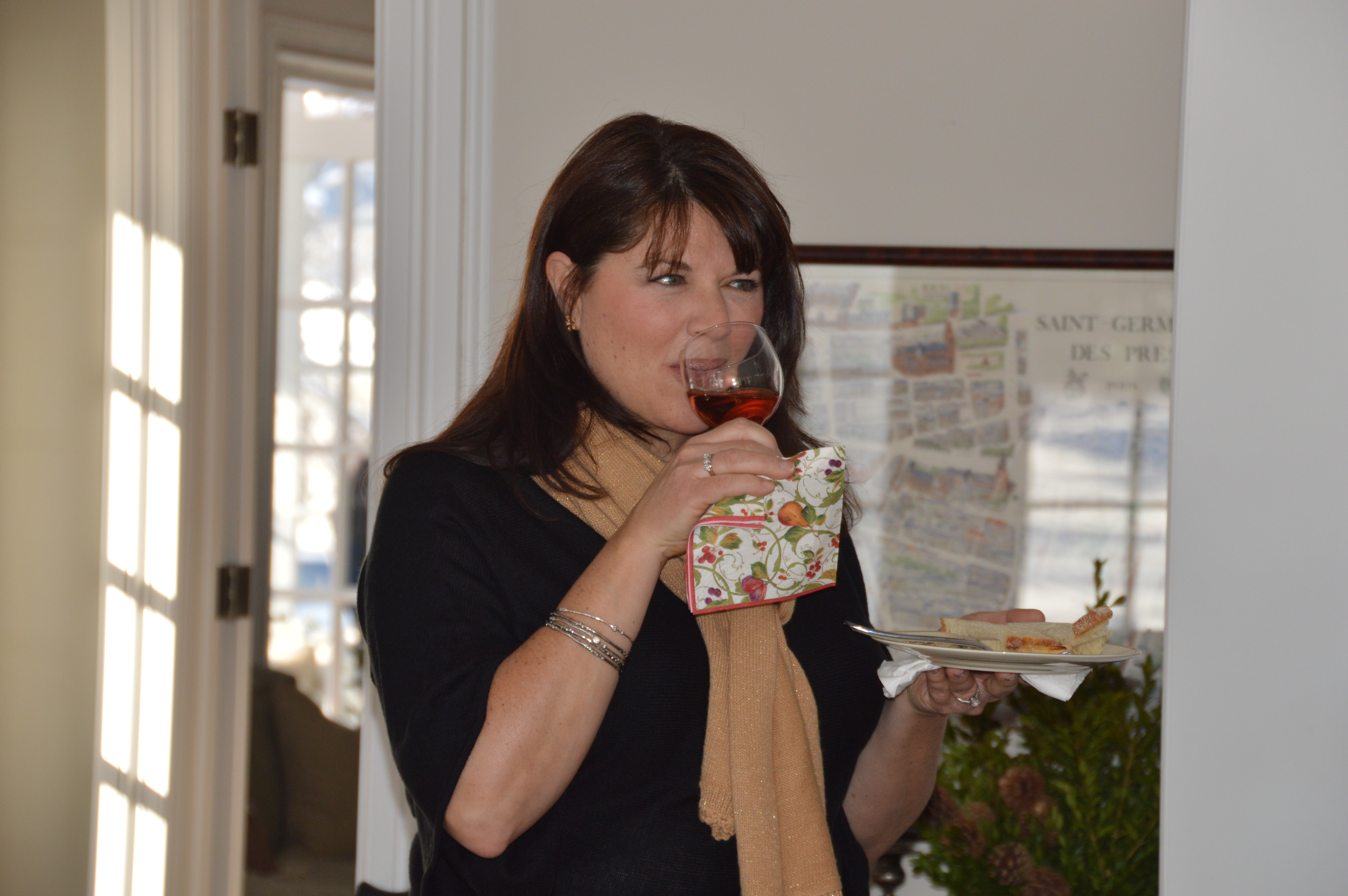 Denise sampling a kir (white wine with a little creme de cassis).