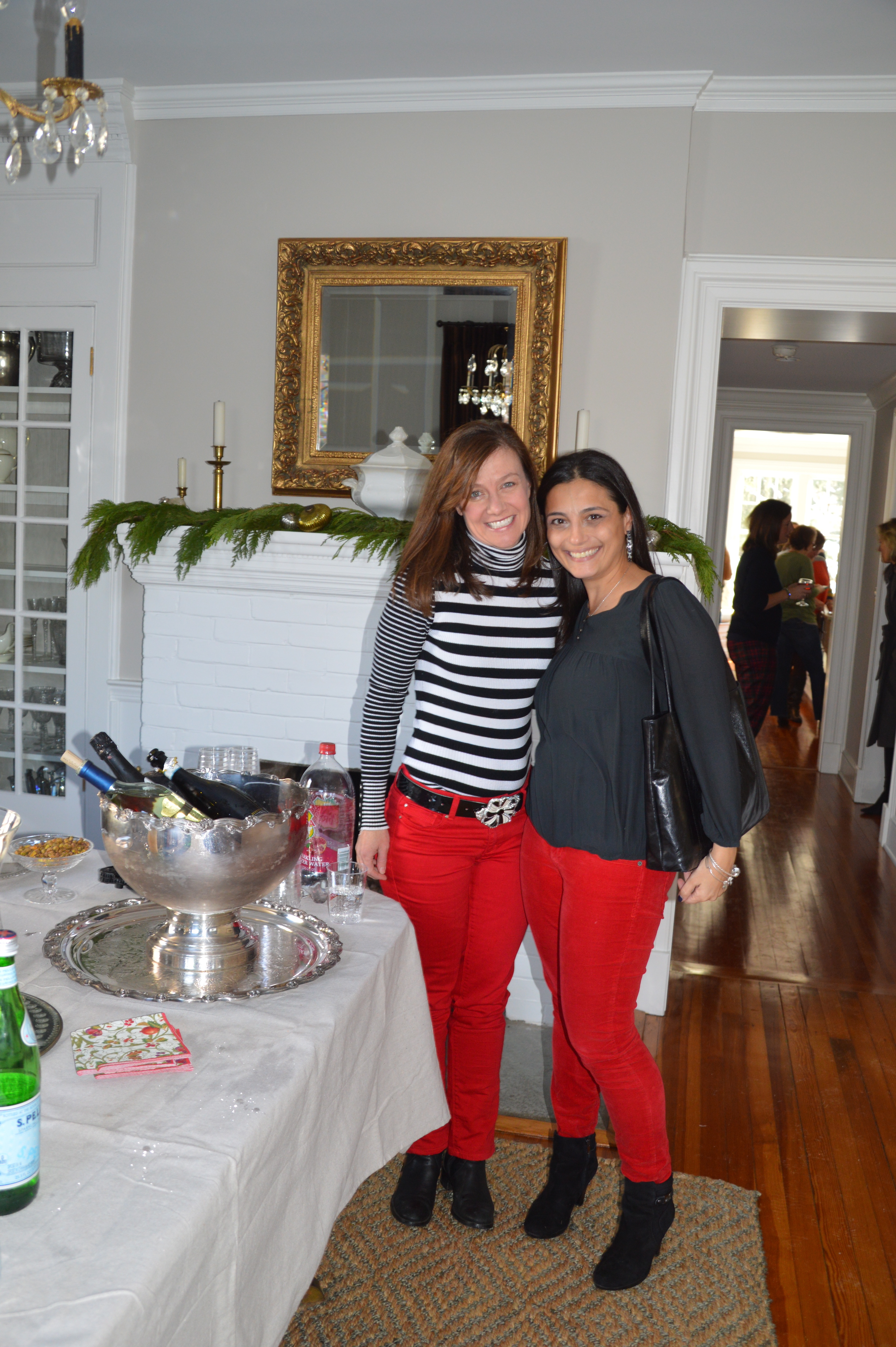 The red pants ladies at the dining room drinks station. Wine chiller is a vintage punch bowl. Table cloth is not expensive French linen but rather a Home Depot drop cloth!
