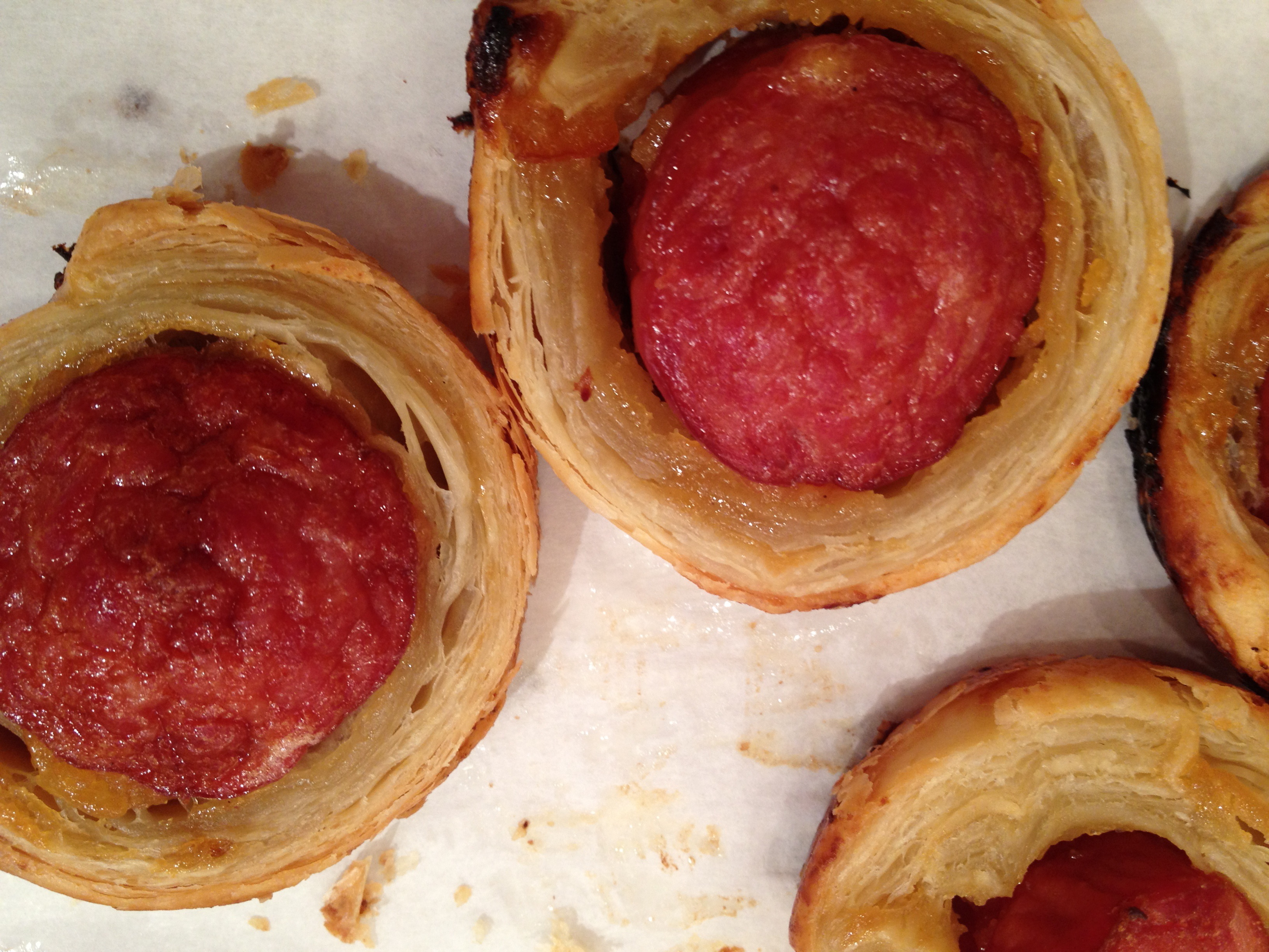 haute dogs: anduilla sausage wrapped in puff pastry.