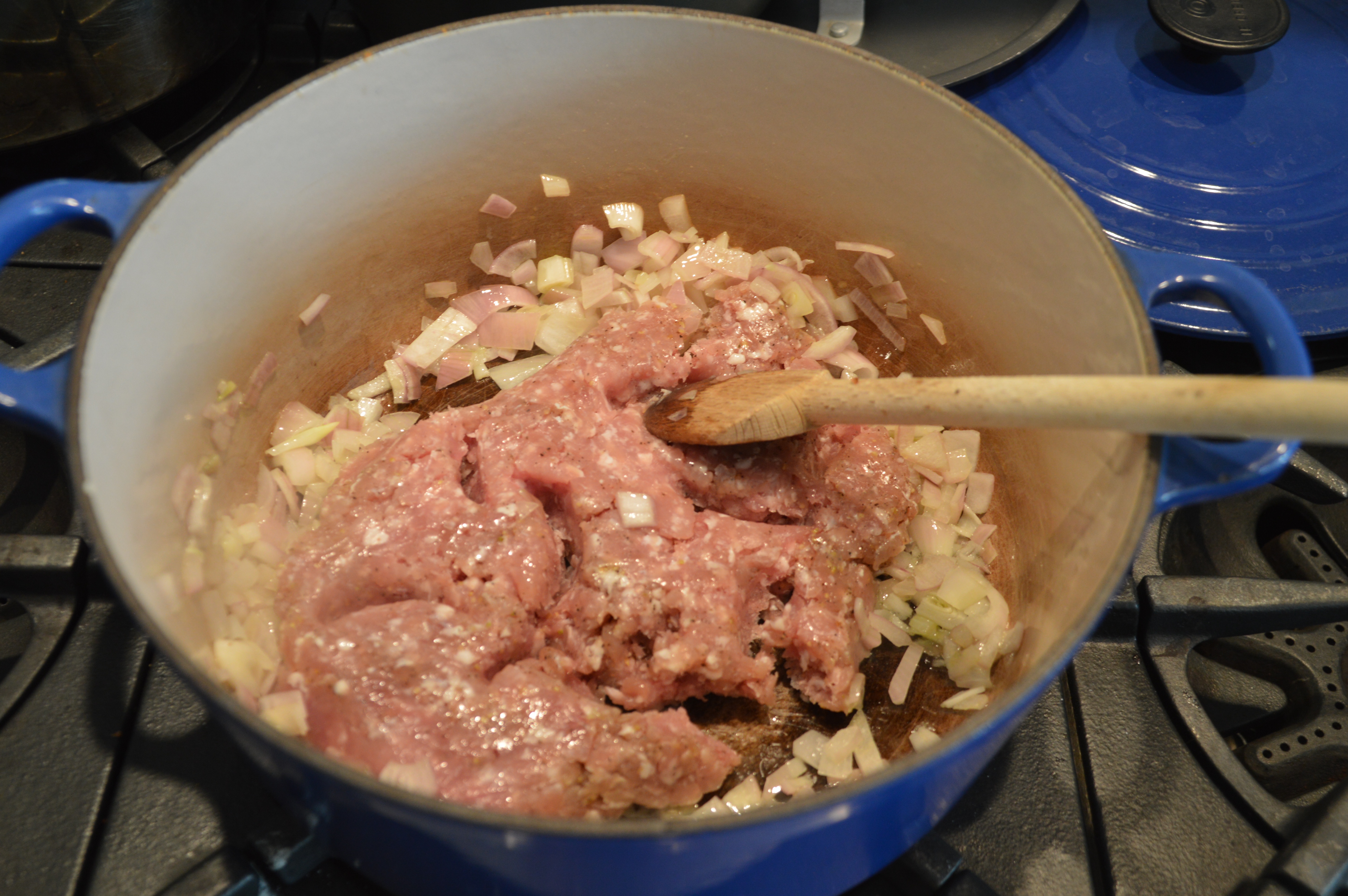 Heat a large heavy pot or Dutch oven over medium heat. Add olive oil and shallots and cook for about 3 minutes. Add the sausage and cook until no longer pink, using a wooden spoon to break up the clumps.