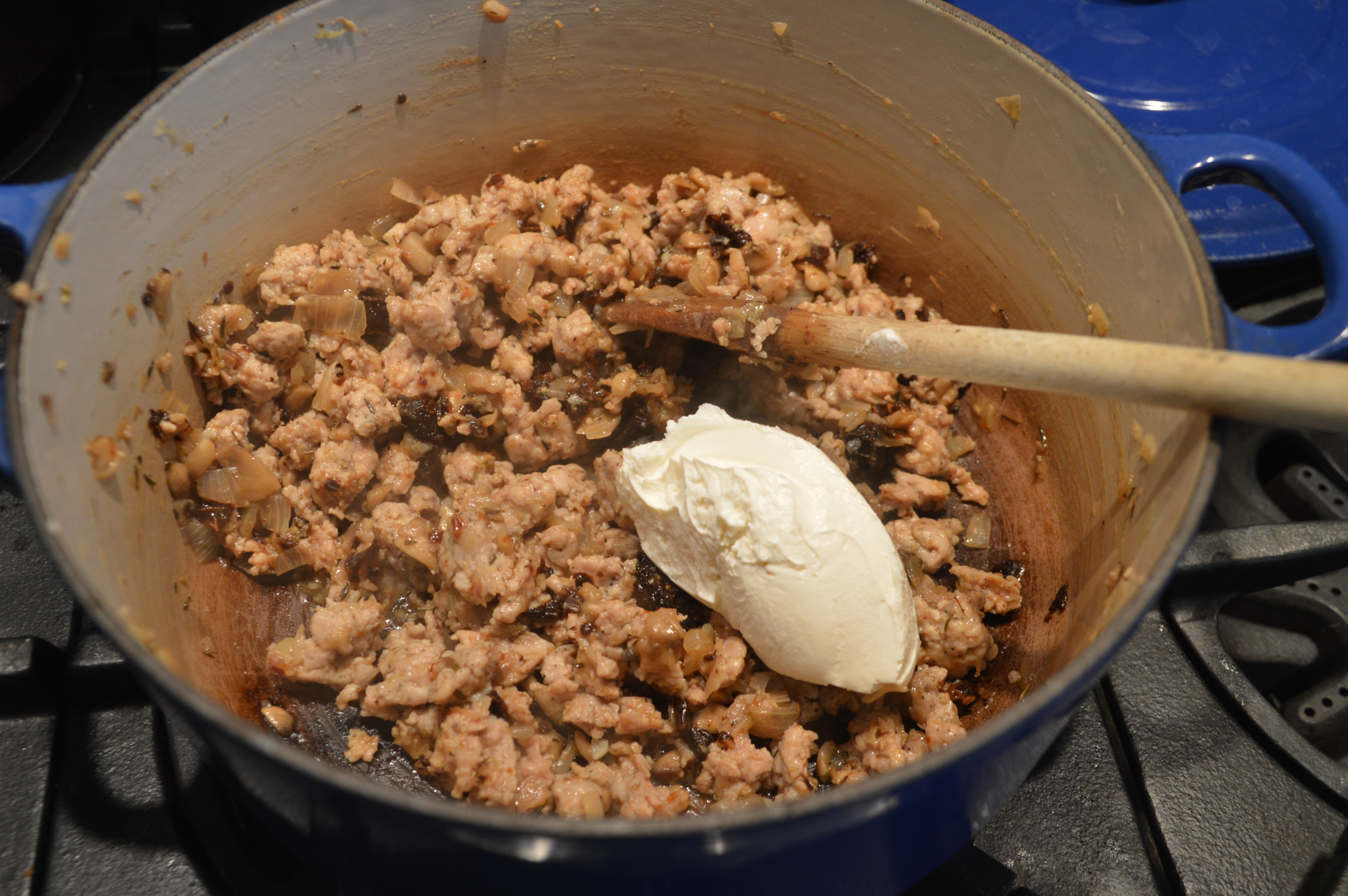 Add the mushroom caps and cook until softened and starting to brown, about 3-5 minutes more. Add the thyme and garlic and cook one more minute. Stir in white wine to deglaze the pot. Add sun-dried tomatoes, Neufchatel cheese, a few grinds of black pepper.