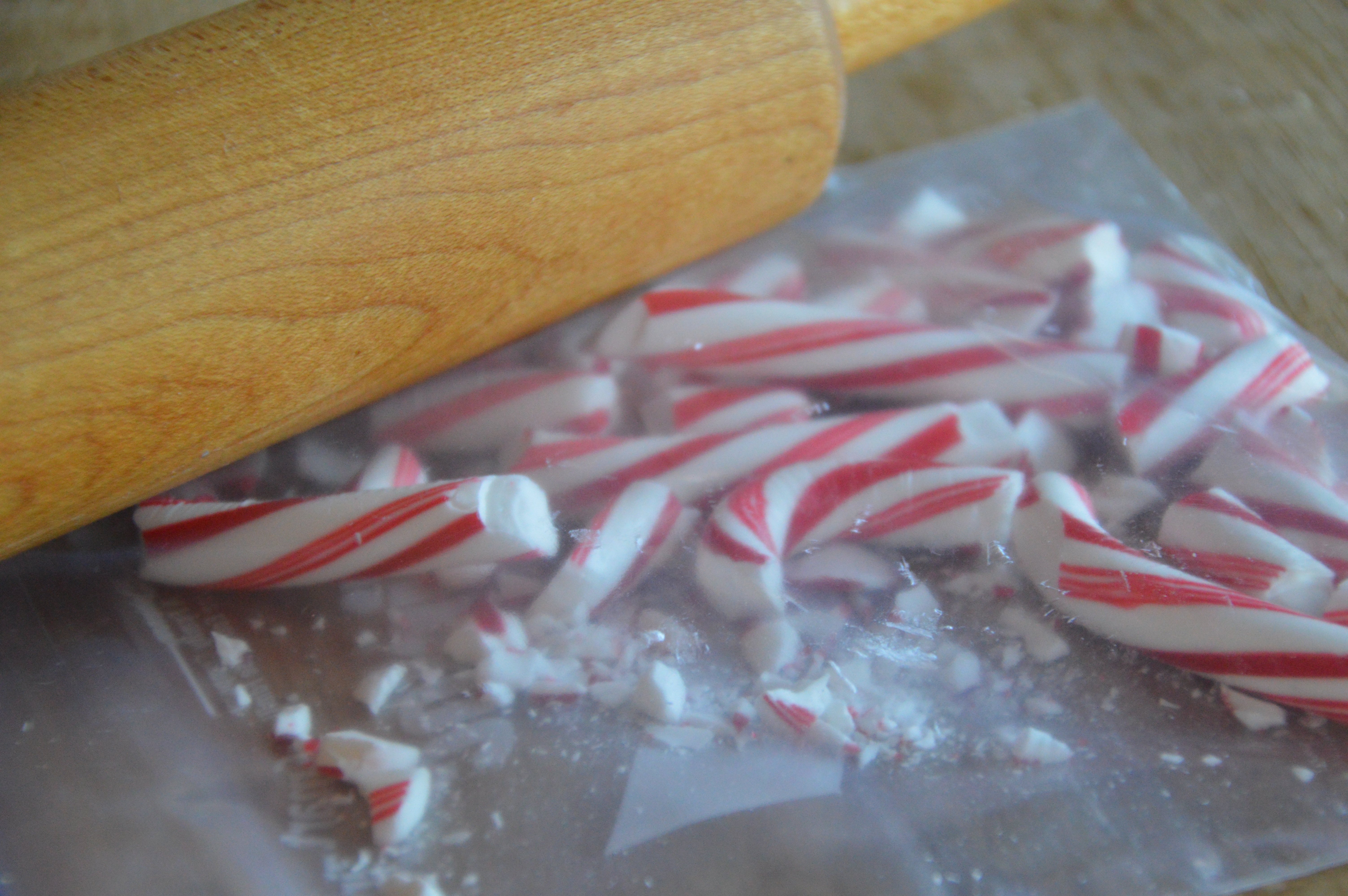 While centers are chilling, unwrap candy canes and place in a zip-top bag. Crush with a rolling pin or wine bottle to make festive candy sprinkles.