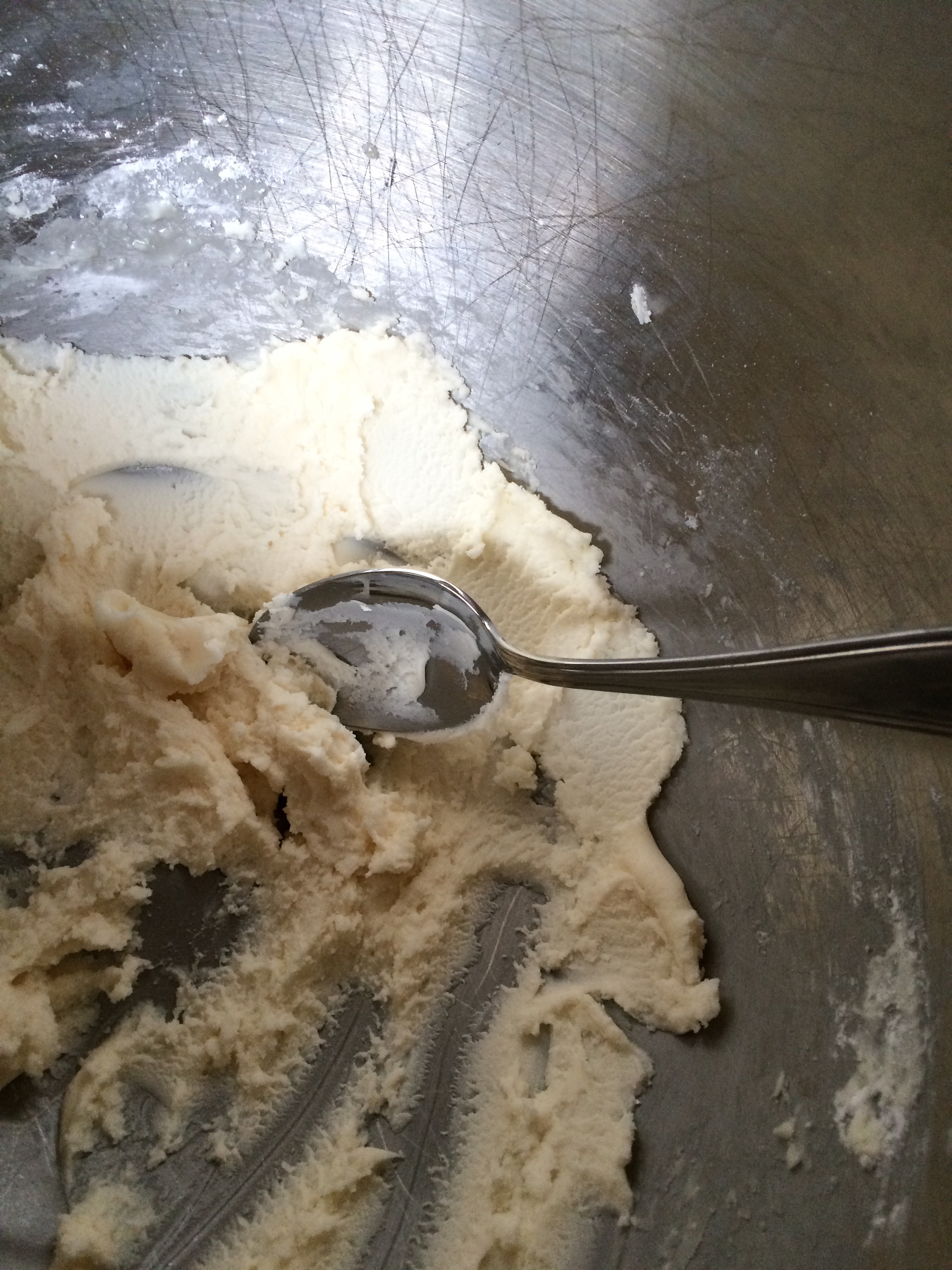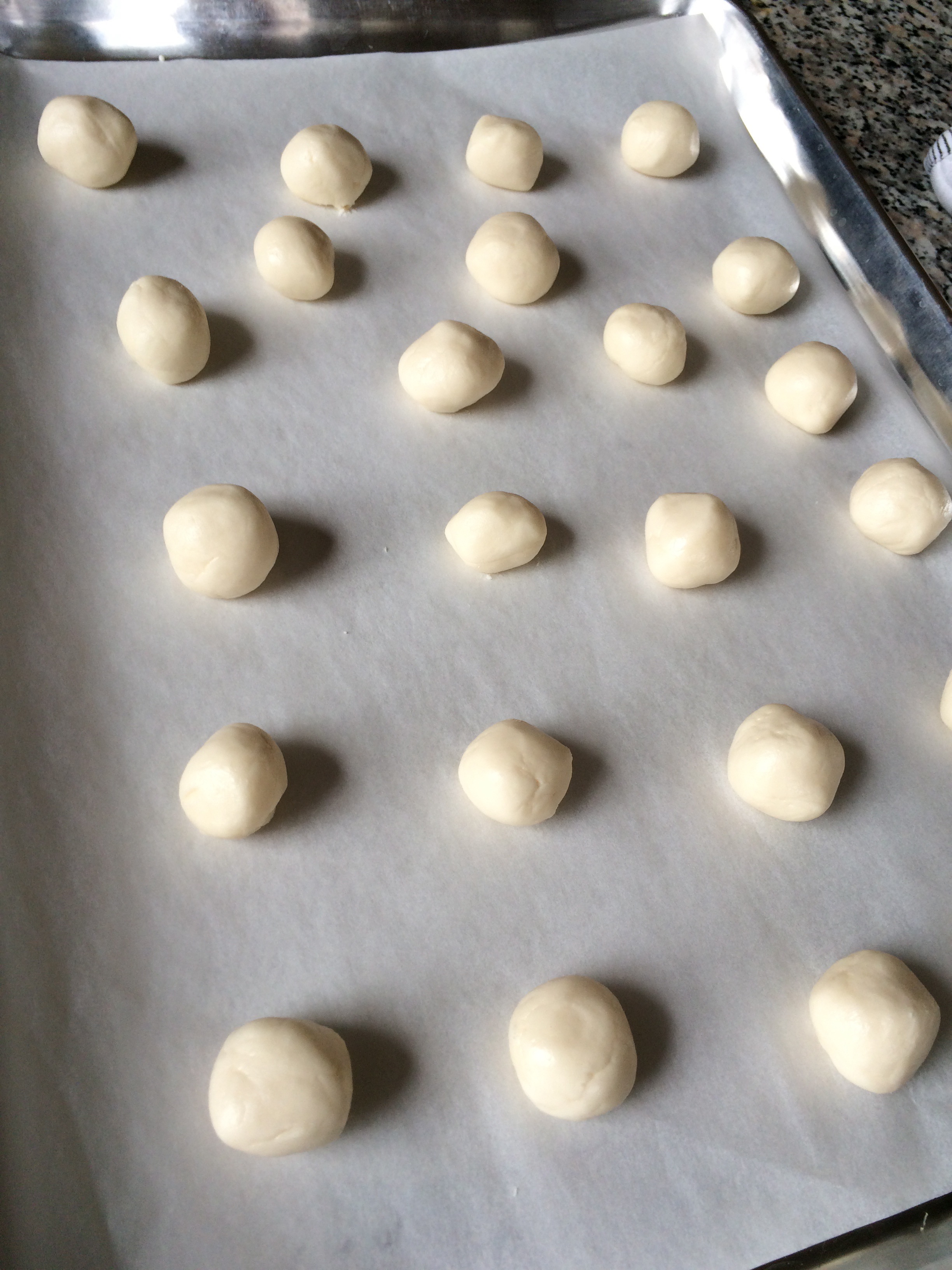 If dough seems too wet to roll/work with, stir in a little more powdered sugar; it should have the consistency of stiff frosting. Roll dough into balls – somewhere between the size of a hazelnut and the size of a walnut (slightly less than 1” balls) – and place on baking sheets lined with parchment or wax paper.