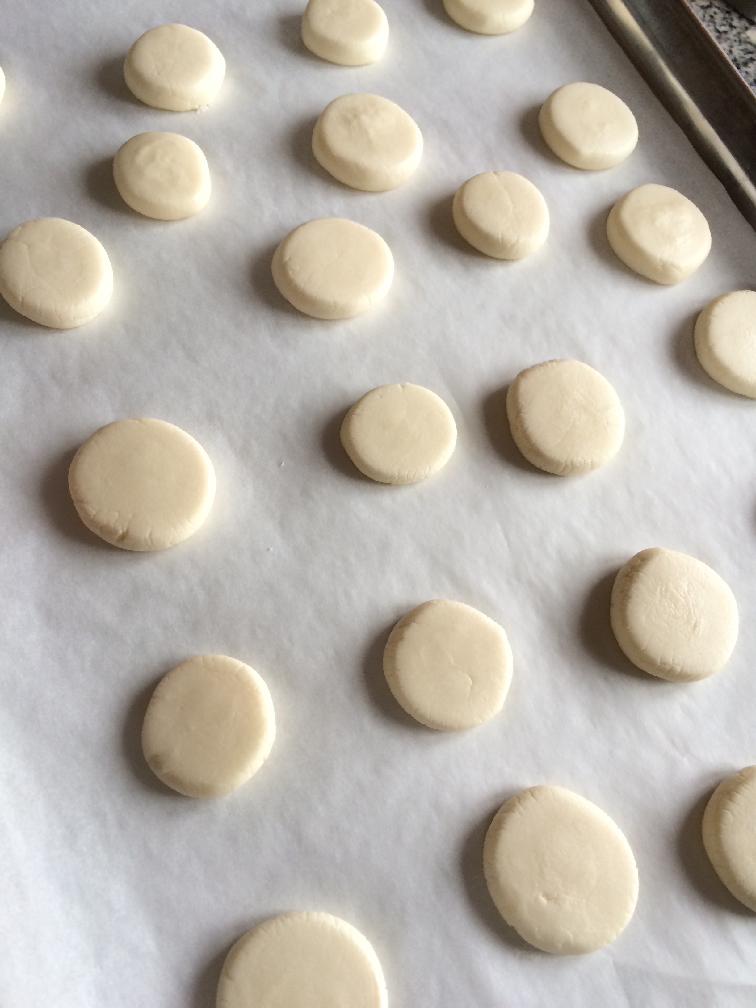 Flatten balls with a flat-bottomed glass to form centers about ¼” thick. (If glass sticks, dust balls with more powdered sugar.) Refrigerate about 20 minutes until firm.