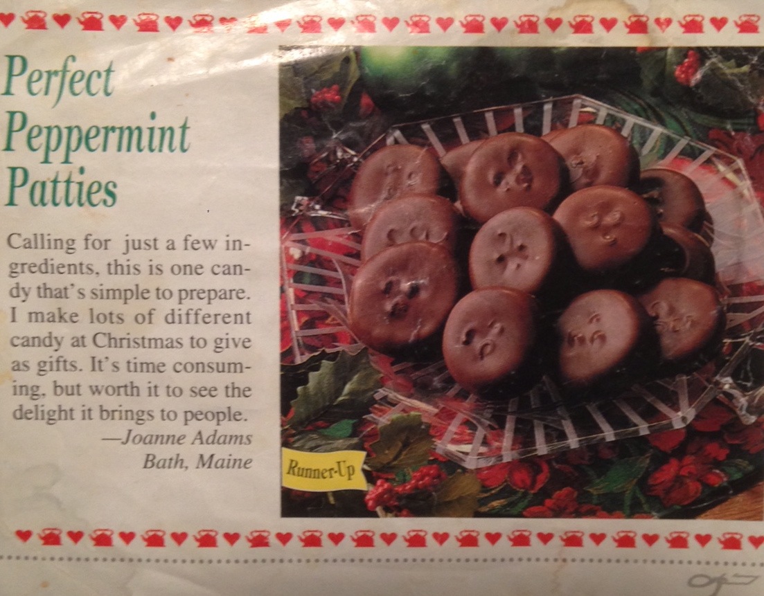 My Ivy-educated, strawberry-blonde sister-in-law Cele has a dry wit and too many talents to itemize, though right up at the top of the list would have to be baking (which she’d deny) and her signature Christmas Cookie Platter. Such precision! Every cookie is perfectly uniform, as if each dough ball were weighed and measured before being shaping into a crescent or whatever. And for me, the stars of Cele’s famous Platter (and the first to disappear) are her quarter-sized, chocolate-dunked peppermint patties. Her patties are perfectly portioned and shaped, like they rolled right off the assembly line, and are evenly enrobed in silky dark chocolate. When I asked Cele if I could feature a (very slight) variation of her recipe on my blog, she dutifully admitted that the original recipe came from a magazine – “maybe Taste of Home?” But Joanne Adams of Maine should get the credit.