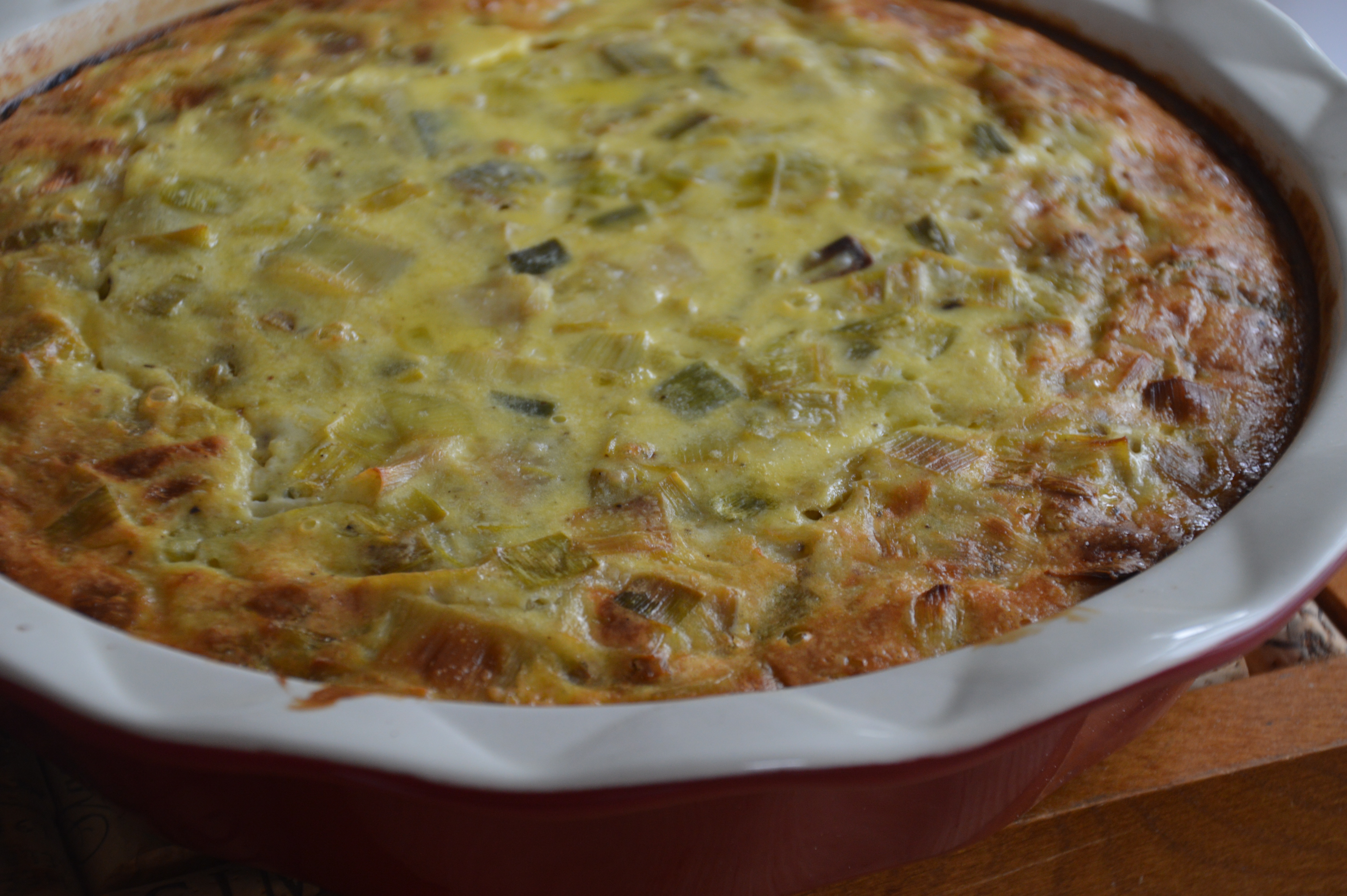 Breakfast, lunch or dinner is served! I tossed around some other names for this dish: Leftovers Pie, Crustless Quiche, Make-Ahead Magic for Overnight Guests, Zap-n-Go Anytime Meal Slices. Some of these are better than others, but they all would work. Frittata sounded a little fancier – worthy of the leeks I used in it this time, but it’s not a traditional frittata. It’s also not as heavy as a cream-laden quiche, but I think you get the idea. I’ve made similar versions without the leeks – just a lone, leftover baked potato and some bits from the Christmas ham. That was good too! But leeks work really well here and bring a much-needed glimmer of spring to the table.