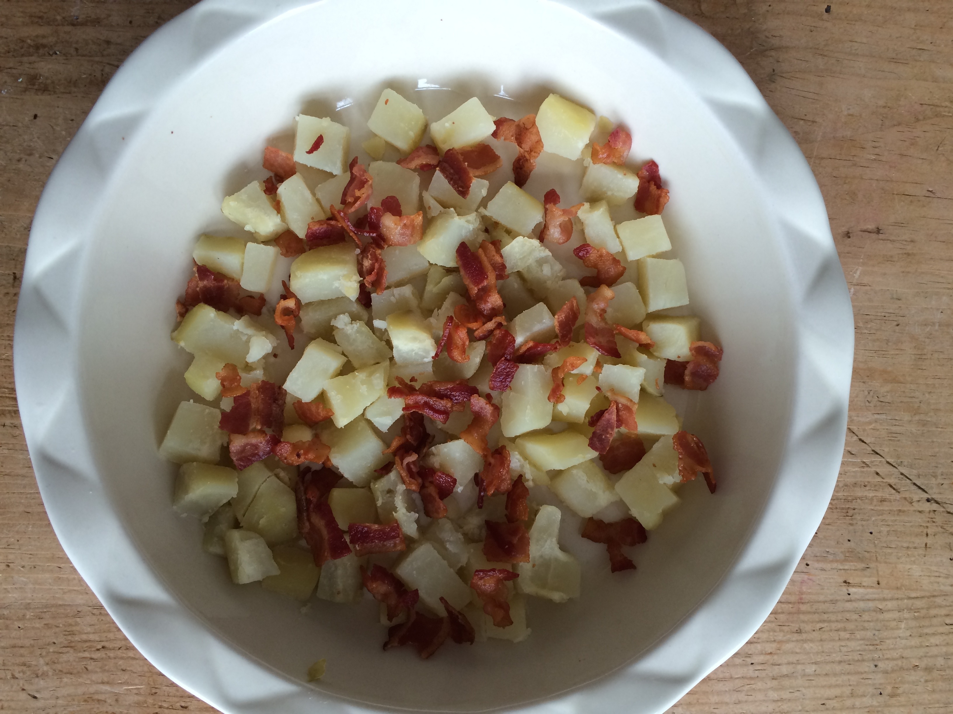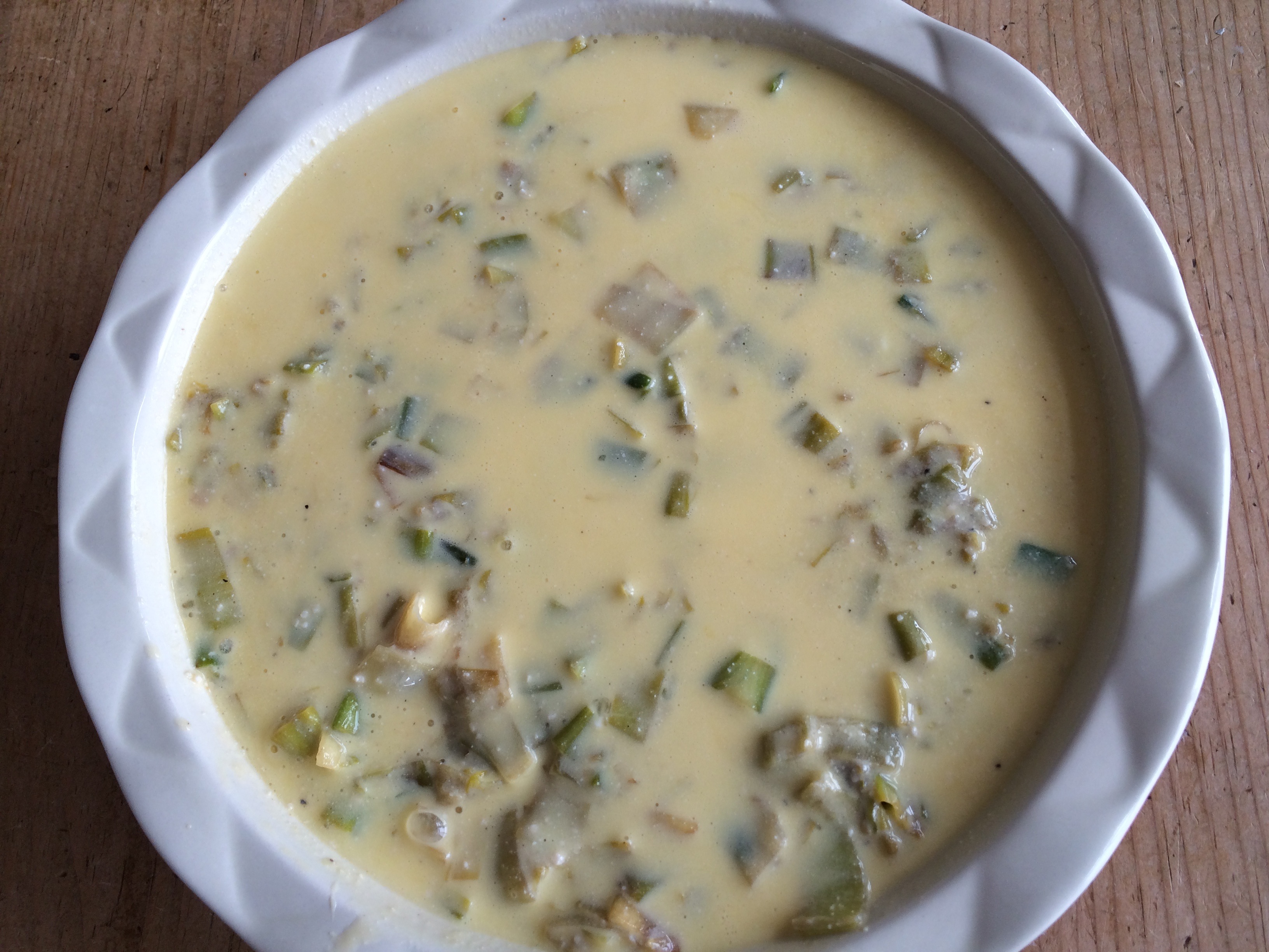 In a 9” pie pan, scatter potato cubes across the bottom. Then scatter cooked bacon, gruyère cheese and leeks.