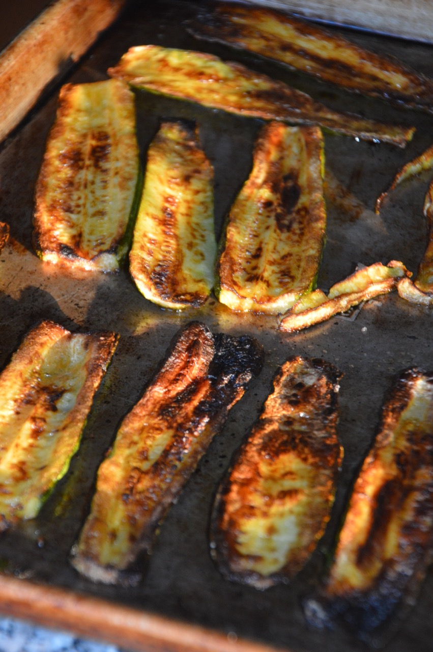 Zucchini planks roasted in a hot oven. I think I stuck these under the broiler for a final 1-minute blast of heat.