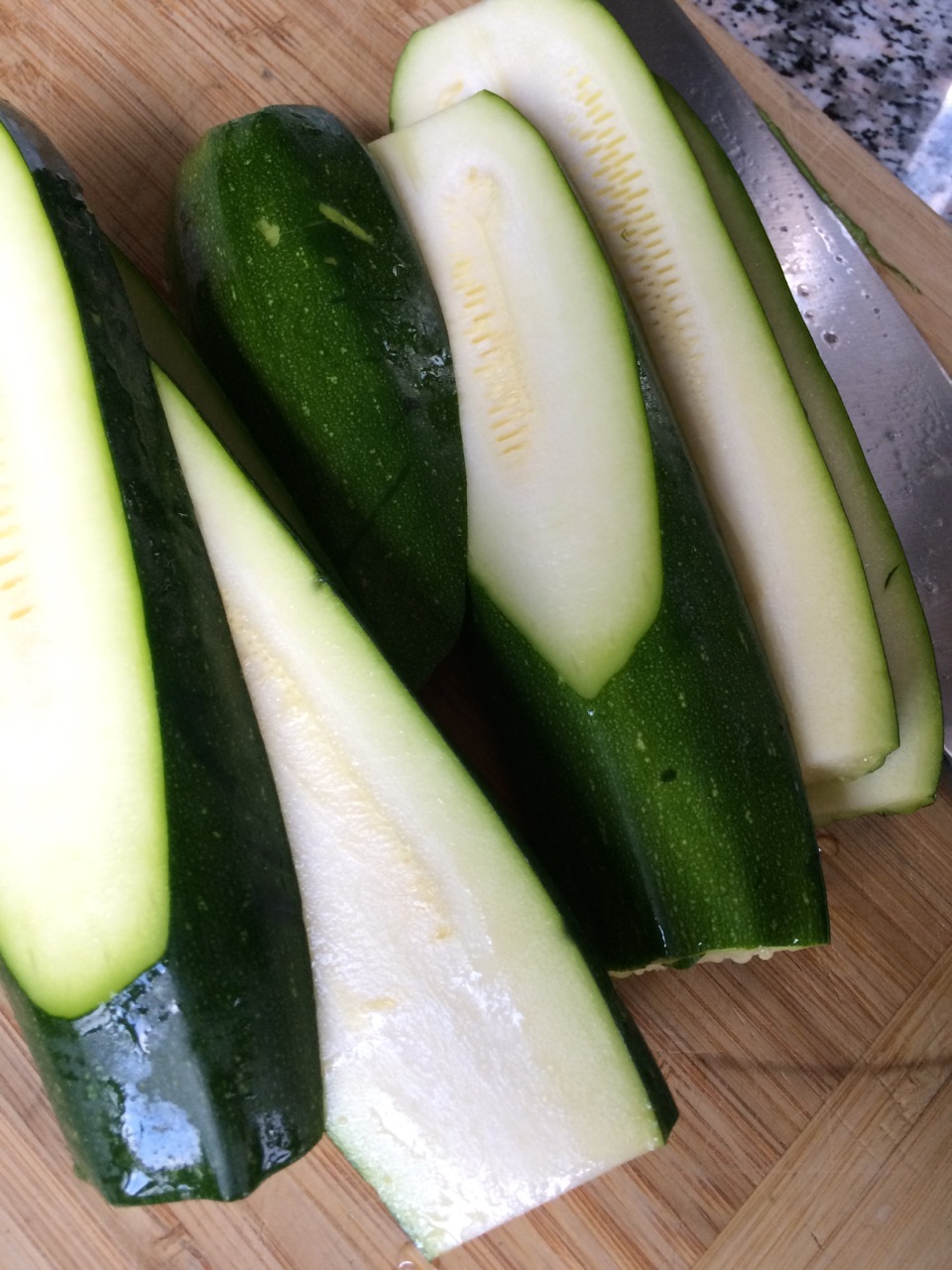 Cut off the stem ends of the zucchini and slice into ½” planks. For very small/thin zucchini, just cut in half.