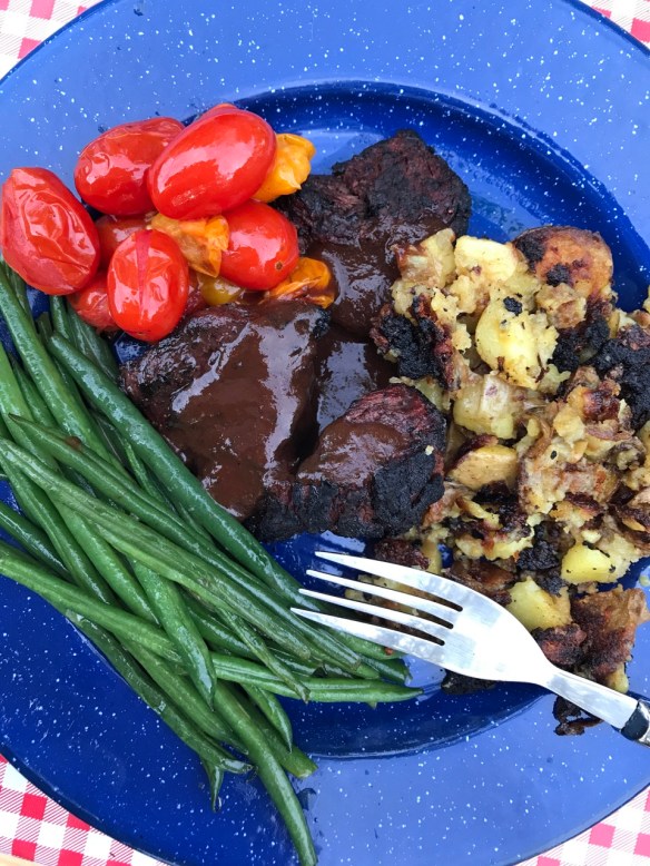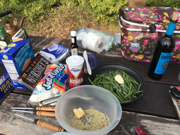 We cooked the green beans in a skillet over the campfire, but otherwise using the same method I do at home –  steam/sautéed with a little butter, water and salt. They turned out great, if I do say so myself! The canned biscuits, however, were an epic fail. Maybe it was for the best that they ended up in the fire.