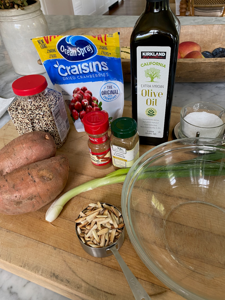 Quinoa (KEEN-wah) is a tiny seed that’s made the big time, and for good reason. It’s gluten-free, loaded with nutrients, and is considered a complete protein. It also makes a great picnic or party salad, like this one with roasted sweet potatoes! (Recipe adapted from Earthly Choice Quinoa.) Quinoa itself is pretty bland, so it really benefits from a seasoned vinaigrette and other flavor-helpers. Double the recipe for a crowd, or for lunches and leftovers.