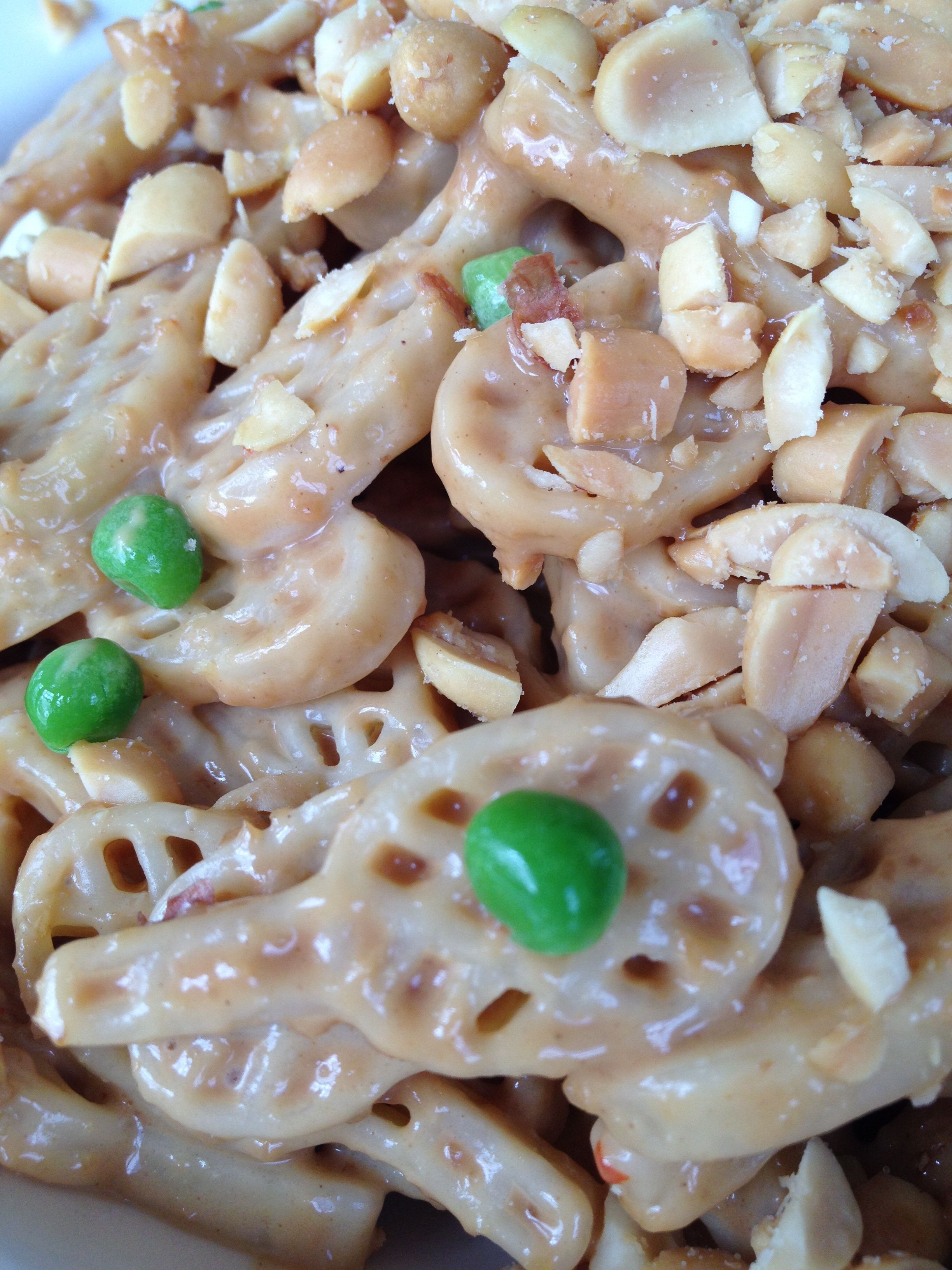 After high school I shelved the tennis racquet (yet oddly kept the big hair and perms going well past college). Last year my love for the sport was rekindled, and with nary a football player in sight. After 8 straight years of childrearing, I think I just needed to get out of the house and do something that didn’t revolve around kids. (Precious as they may be.) Plus, the women on my league teams (indoor winter and outdoor spring) are supportive as well as fun. I think they put up with my less-than-stellar record because I bring tennis ball cookies and good post-match lunches when it’s my turn. Since today was my turn, I broke out the racchette pasta that I found in a grocery store months ago. Normally I make peanut noodles with spaghetti, but I couldn’t resist the racquets for this occasion. Along with some grilled chicken and a “Thai Crunch” salad, it was an ace of a meal. If only my matches could be as successful!