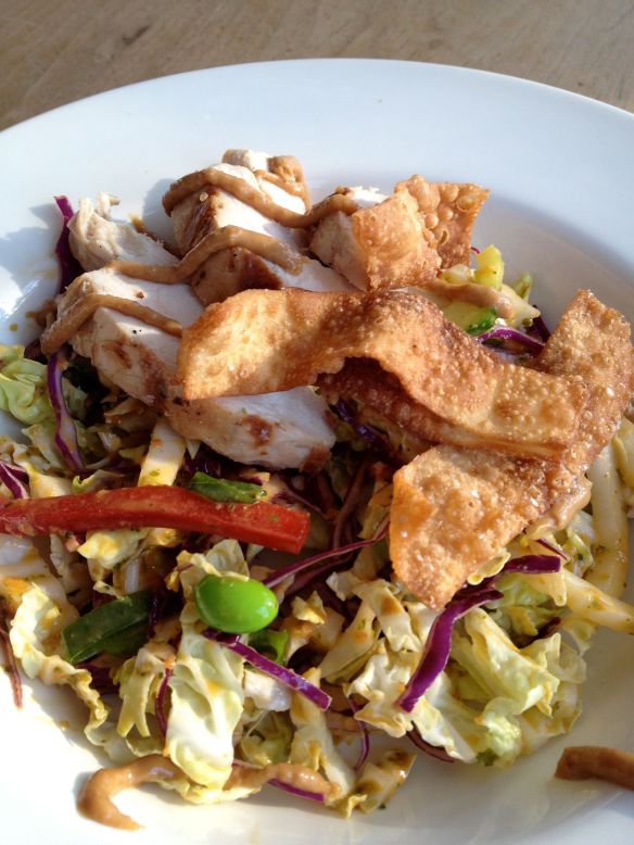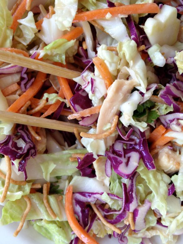 To make all the components for this is a bit of a process (and you’ll feel like your entire pantry is out on your countertop), but a) it’s worth the effort, and b) you don’t have to do everything every time. For example, use shredded rotisserie chicken instead of grilling your own. Or use crunchy rice noodles instead of frying wonton strips. (Though the crispy wonton strips are usually everyone’s favorite part, and they’re very quick to make.) Or make only the salad, or only the peanut sauce and noodles. You get the idea. If you’re going to make the marinated chicken, salad dressing and peanut sauce, get out all of the ingredients and try to assembly-line the process since many of the same ingredients are called for. The good news is that everything can be made well in advance and then just assembled prior to serving. (I made everything for today’s lunch yesterday.) And if you have an immersion blender, making the 2 sauces is a snap.