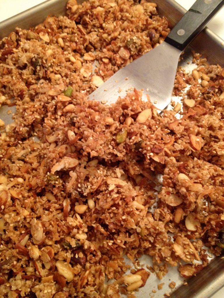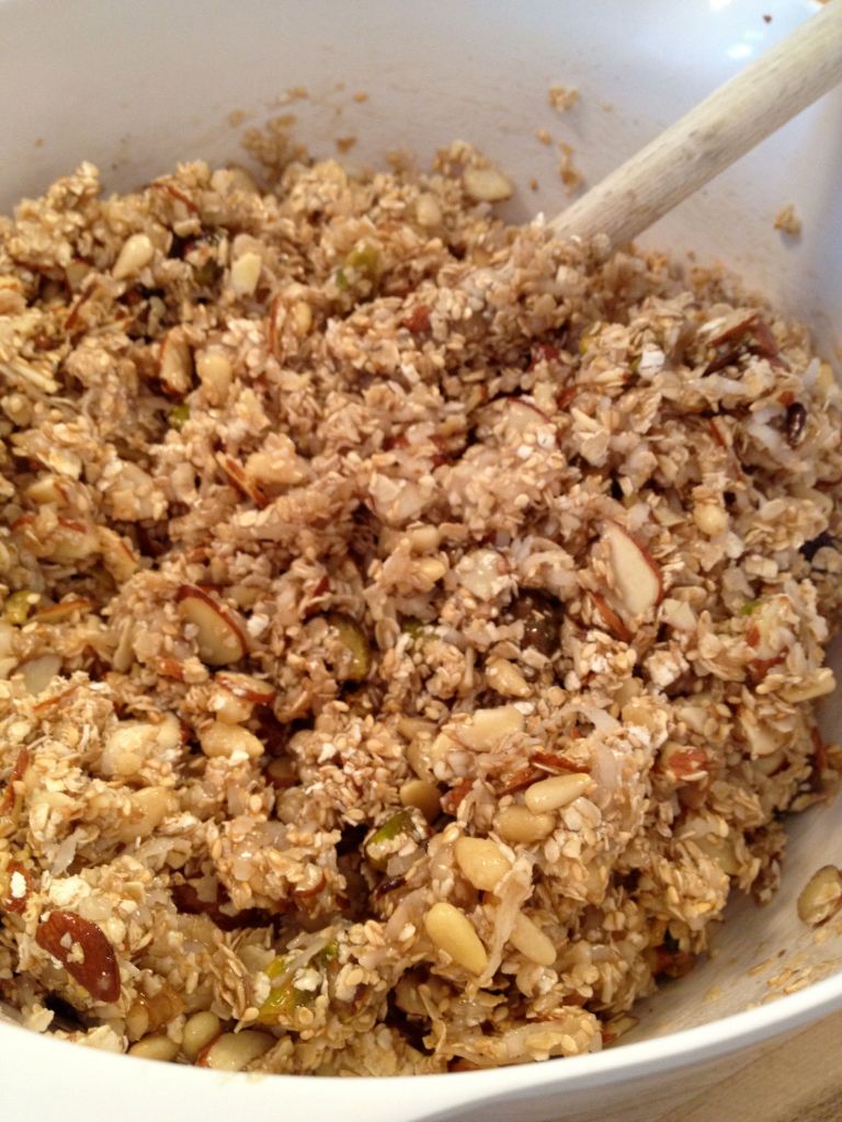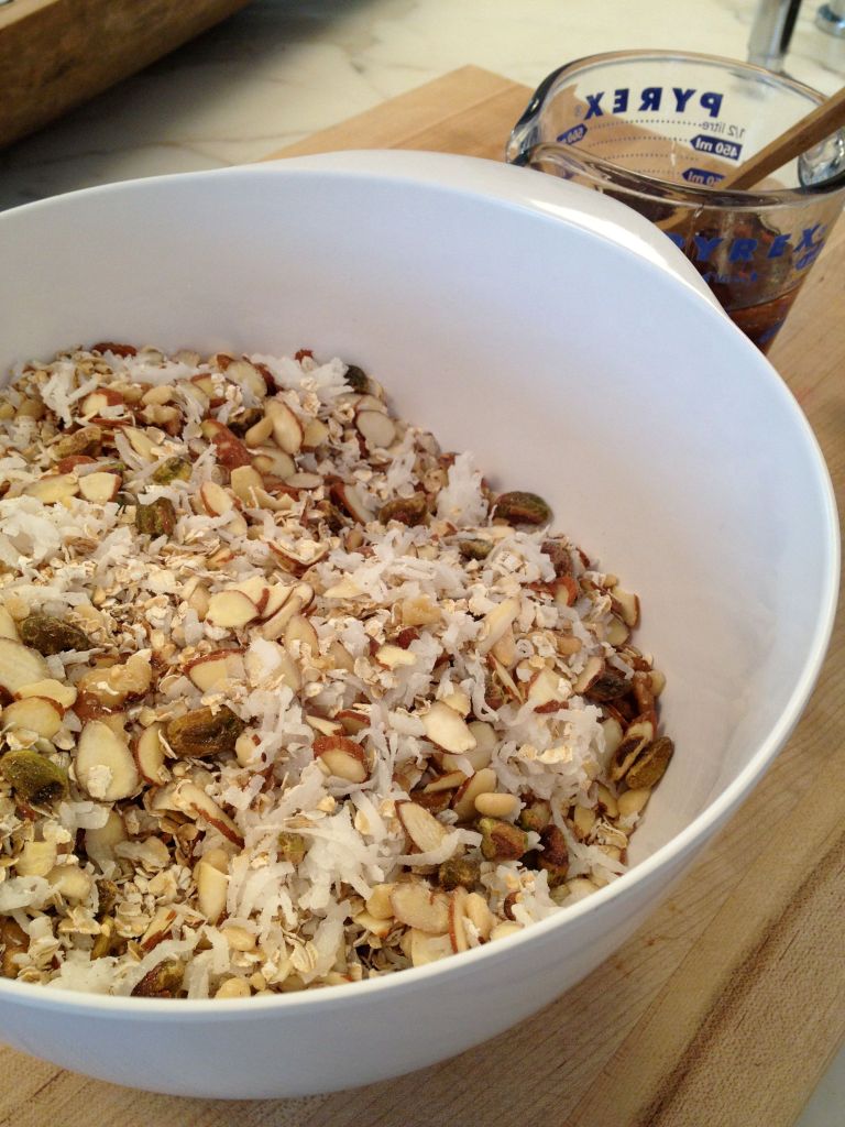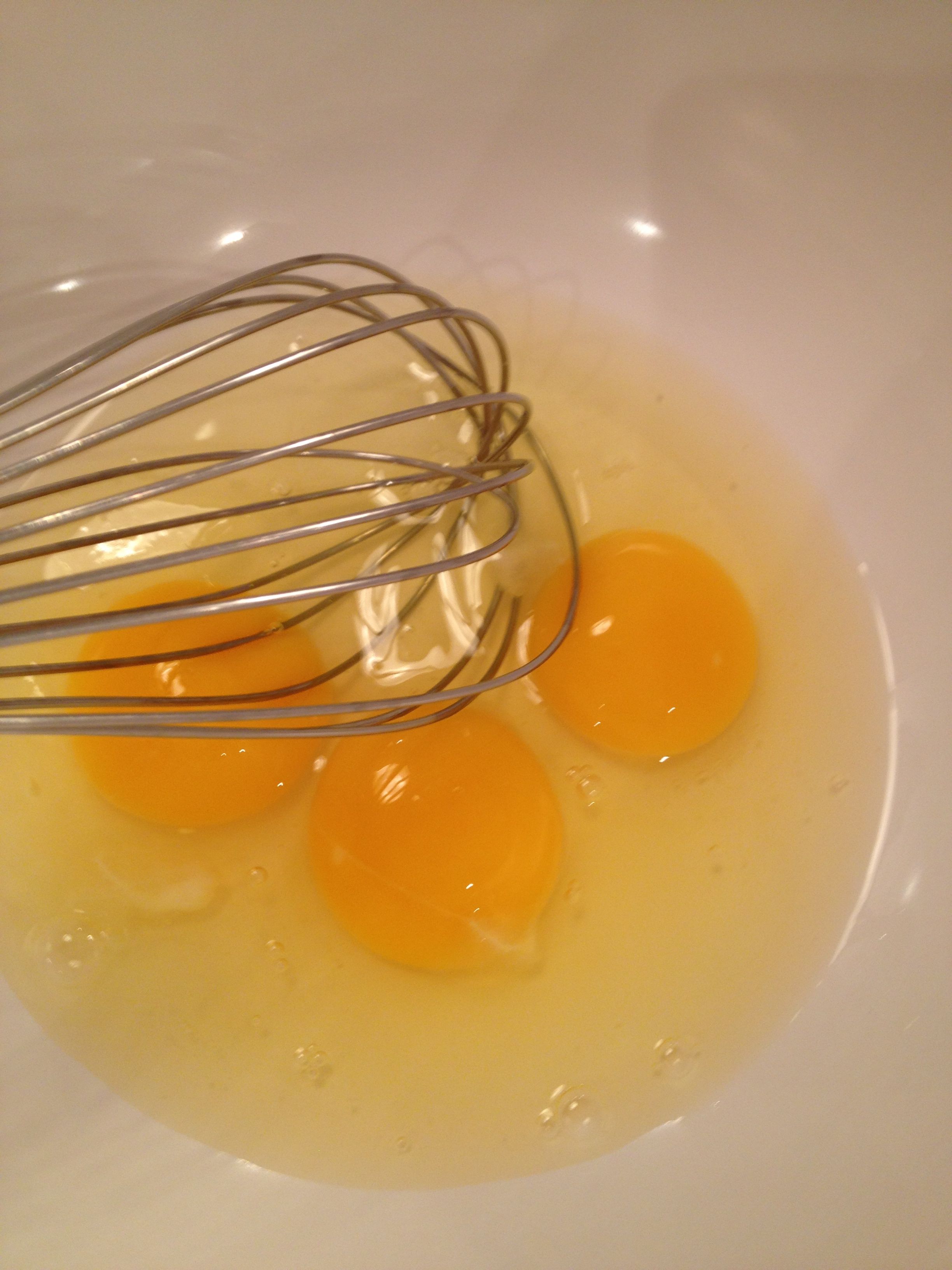Pour mixture into a 9”x9” baking dish or small casserole. (Auntie Jo says to heat casserole with oil first; I don’t do this and don’t have any problems getting the fritatta out of my Pyrex baking dish.)