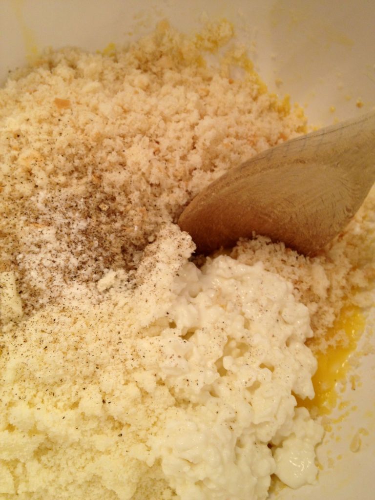 Stir in breadcrumbs, cheeses, salt and pepper.
