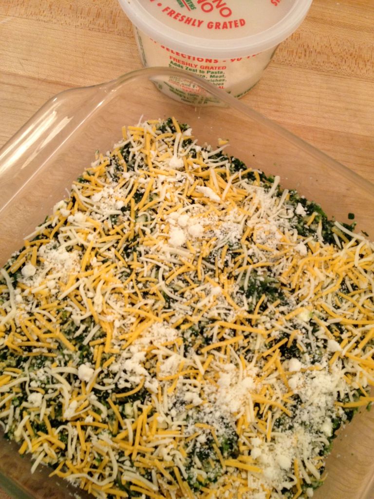 Sprinkle a small amount (less than ¼ cup) of grated cheese on top; this gives the frittata a nice golden brown color. (I used the cheddar/jack mix with a little bit of additional romano.)