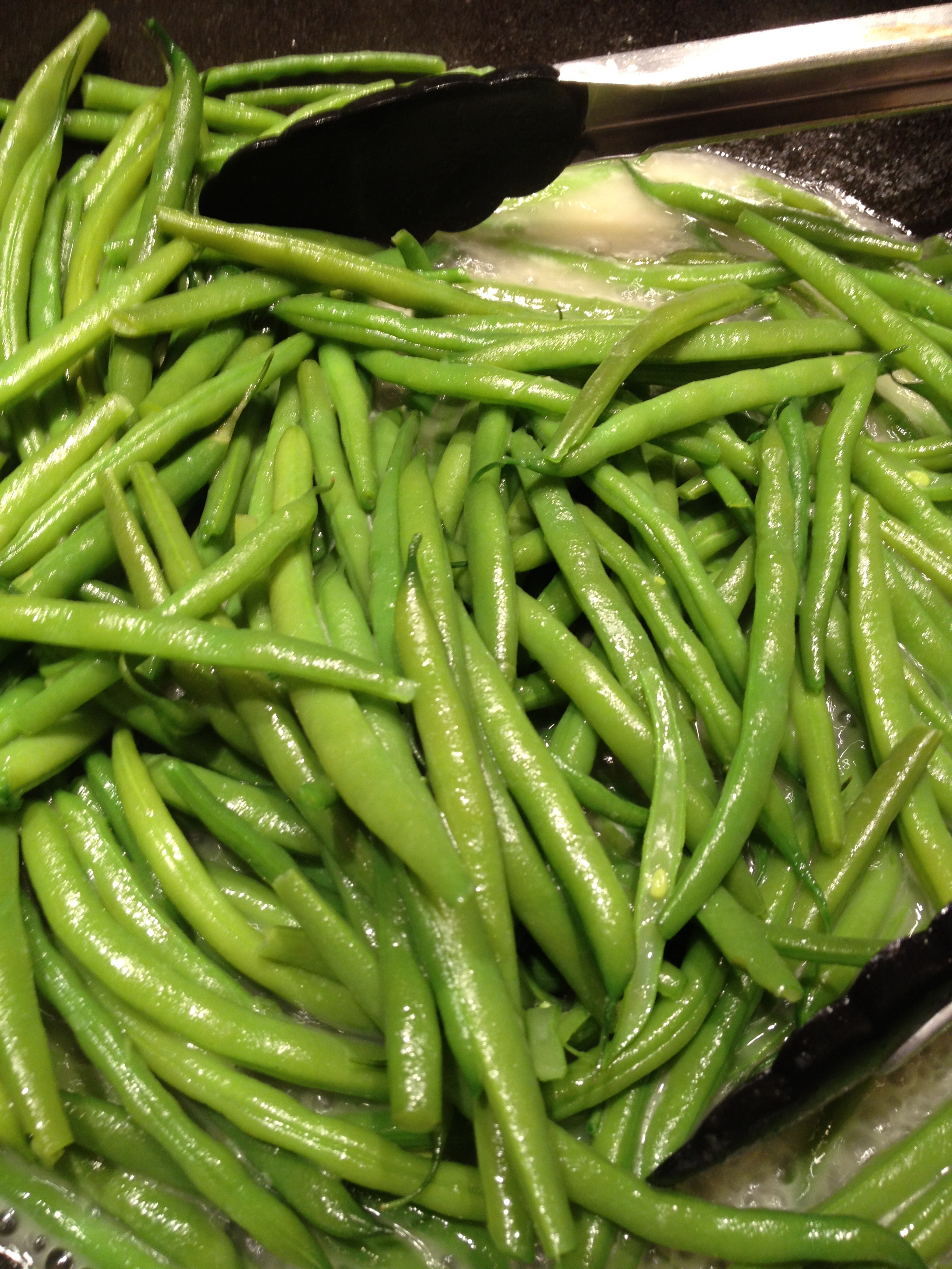 “Proper” technique for cooking green beans (regular or haricots verts) is to blanch them in boiling water for about 2 minutes, then drain, rinse and cool in an ice bath (to stop the cooking). Then, you sauté the barely-cooked beans in butter and/or oil until just tender. This is not a bad method – especially if you want to blanch the beans a day ahead of time– but I have found that the extra steps (and dishes) are not necessary. Especially if you cook beans a lot – which we do.