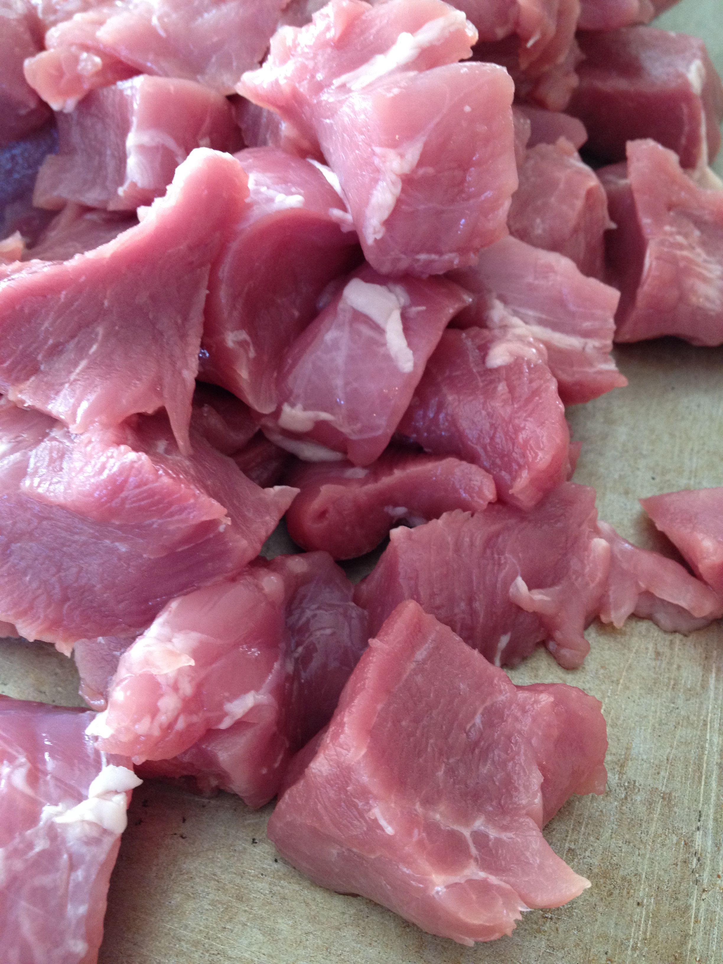 • 3-4 lbs pork tenderloin, pork loin or turkey breast, trimmed and cut into 1½” cubes