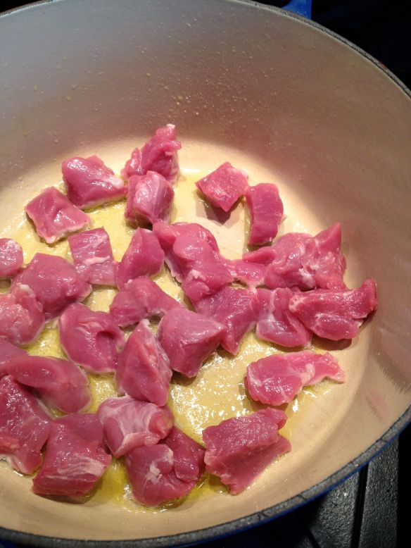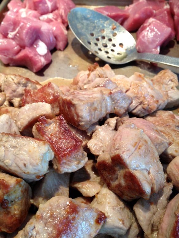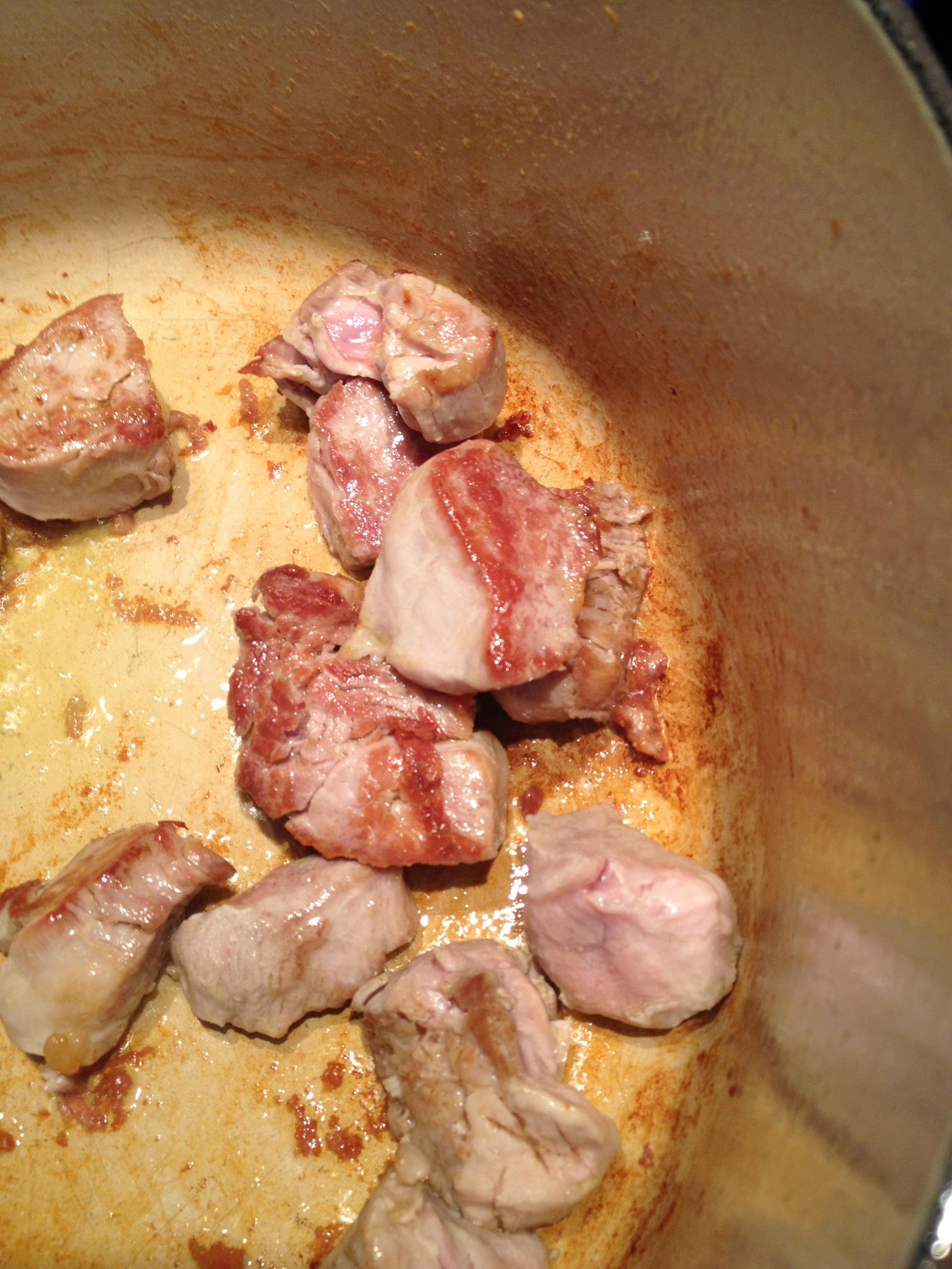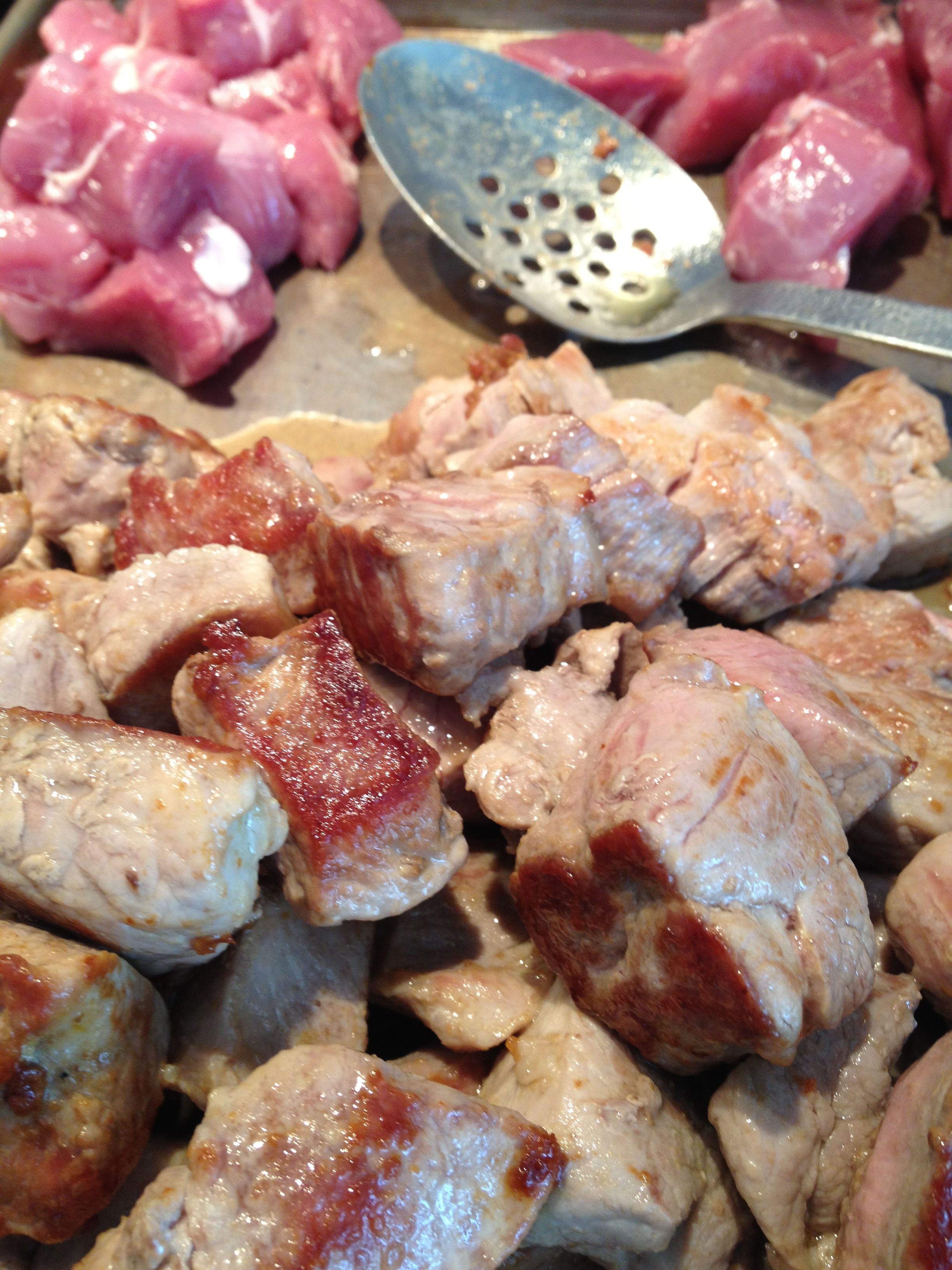 When at least 2 sides of the meat cubes have browned, remove from pan and repeat with the next batch of meat (adding more olive oil as necessary). The meat cubes will not be all the way cooked. To keep dirty dishes to a minimum, you can place the browned meat back on the same platter/baking sheet with the uncooked meat cubes since it’s all going back into the pot anyway.