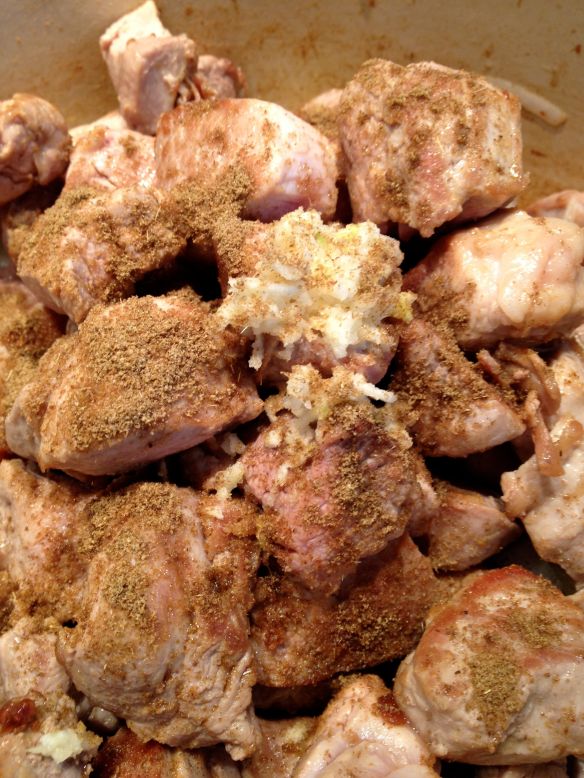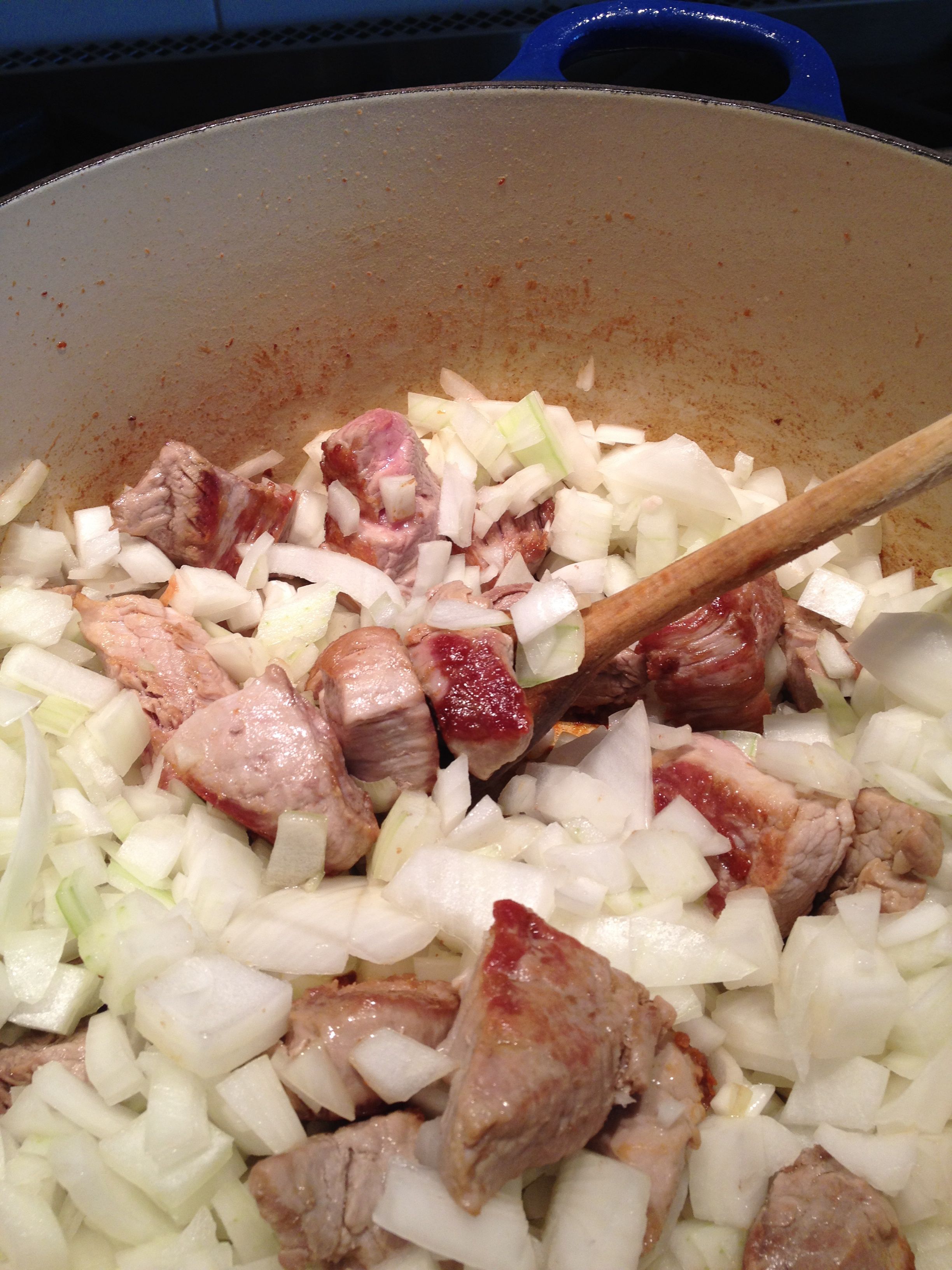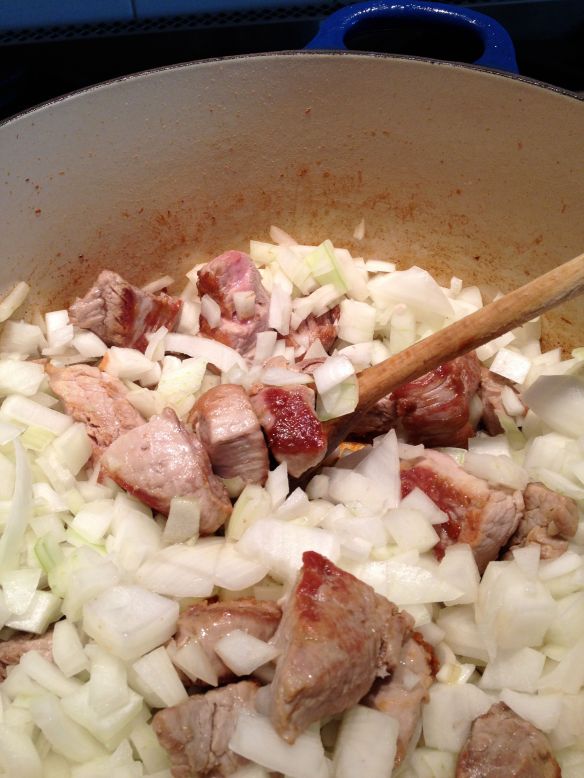 Once all the meat has been browned and removed from the pot, add the diced onions and sauté a few minutes until softened, adding another splash of olive oil if necessary. Note that in this batch I got lazy and just added the onions to the pot with the meat. Since the chile verde cooked for so long in the oven, it didn’t matter in the end. Sautéing first is safer, though; the texture of not fully cooked onions would detract from the dish. Then add the browned pork and any accumulated juices back to the pot.