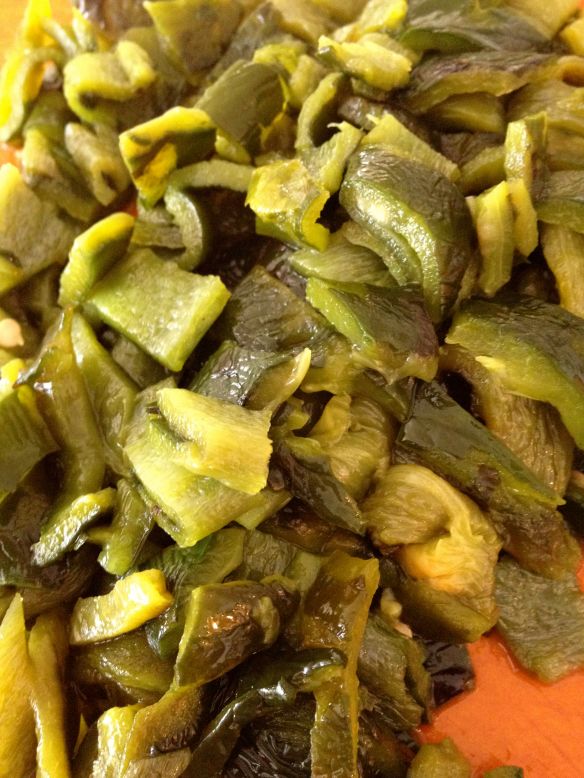 When chiles are cool, slip off the burnt skins (wearing gloves if you have sensitive skin), then pull off the stem tops and seeds. (Use a spoon to scrape off seeds, or give the chiles a quick rinse under cold water.) Be careful not to touch your eyes during this process! Slice the chiles into strips and then chop into pieces.
