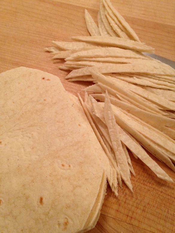 Set a large tray or baking sheet covered with paper towels next to the stove. In a large cast iron pan or Dutch oven, pour in approx. ½” – 1” vegetable oil. Heat on medium high until shimmering. Fry tortilla slivers in batches, about a handful at a time. Using a strainer or tongs, stir the tortilla slivers around a little until they are golden brown. (You don’t need to turn them.) Remove slivers from oil and let drain on paper towel tray. Sprinkle with kosher salt while still hot. Repeat with the next batch until all strips are fried. Store in an airtight bag or container. Will keep for several days if you hide them from kids or other snackers.