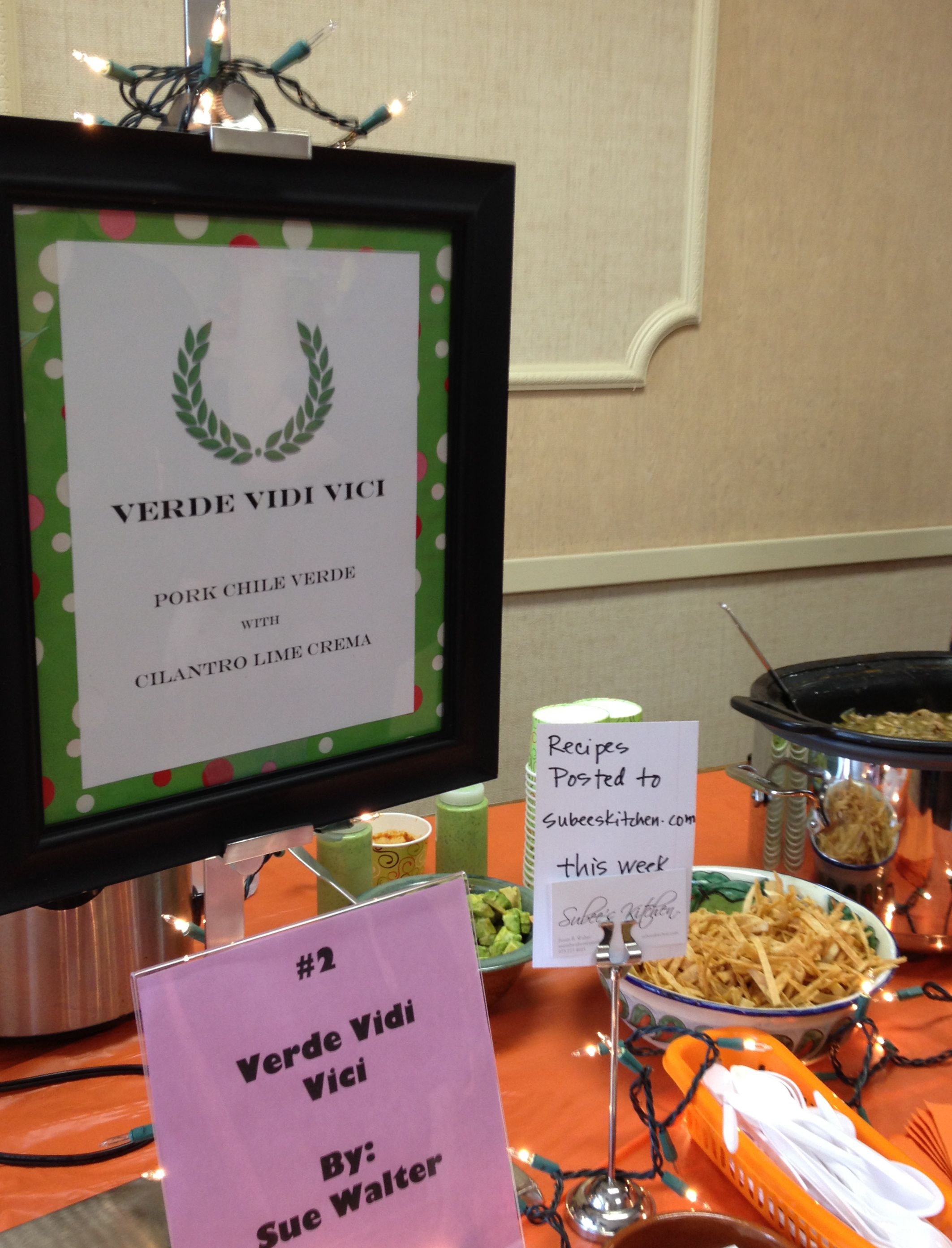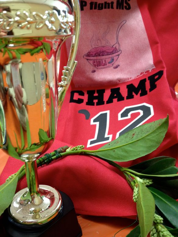 Verde Vidi Vici! Amid a highly competitive field of entries, my prophetically titled chile verde took top honors this past weekend at the second annual Chili Cook-Off fundraiser for MS. I promised to post the recipe if I won, so here it is – secrets and all. (Guess I’ll have to come up with a new chili recipe and bad pun title for next year.)