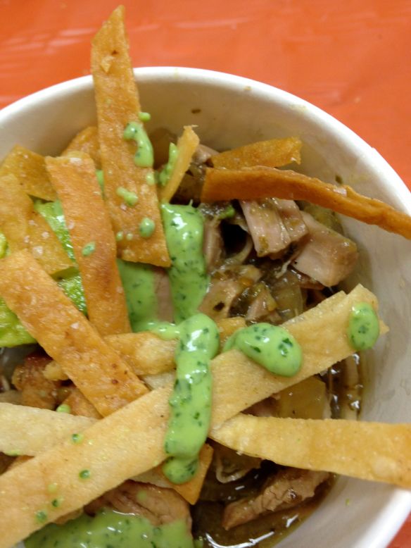 Some chili tasters at the cook-off may have been swayed (as was the plan) by my dish-enhancing garnishes: diced avocado, homemade corn tortilla crisps, and a drizzle of my no-longer-secret cilantro lime sauce. (I featured the cilantro sauce recipe in my Almost Famous Turkey Burgers post, but have reprinted it here below.) The avocado and cilantro sauce lend cooling, fresh notes to the spicy, slow-cooked chile verde, and the tortilla crisps provide textural contrast (something I’m always striving for). If you don’t feel like making homemade tortilla crisps, a handful of crushed tortilla chips would deliver similar results.