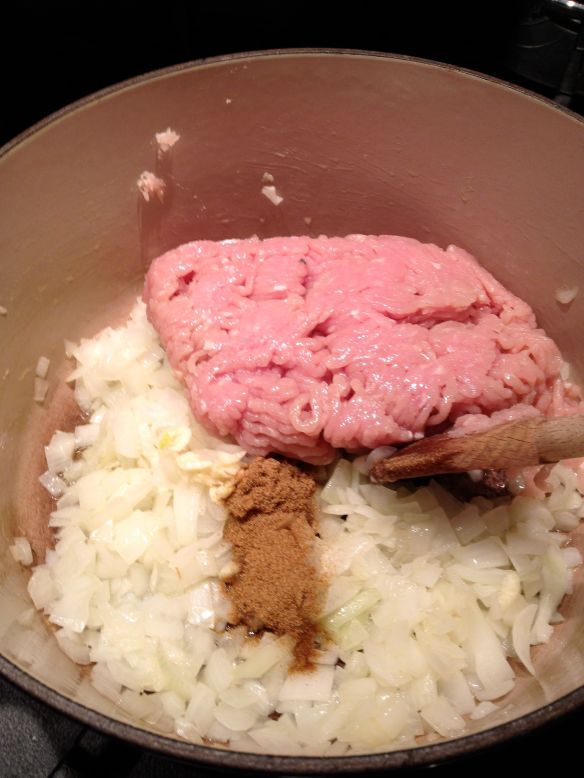 Add turkey, salt and cumin and cook until no longer pink. (Breaking up turkey clumps with a wooden spoon, as if making tacos.)
