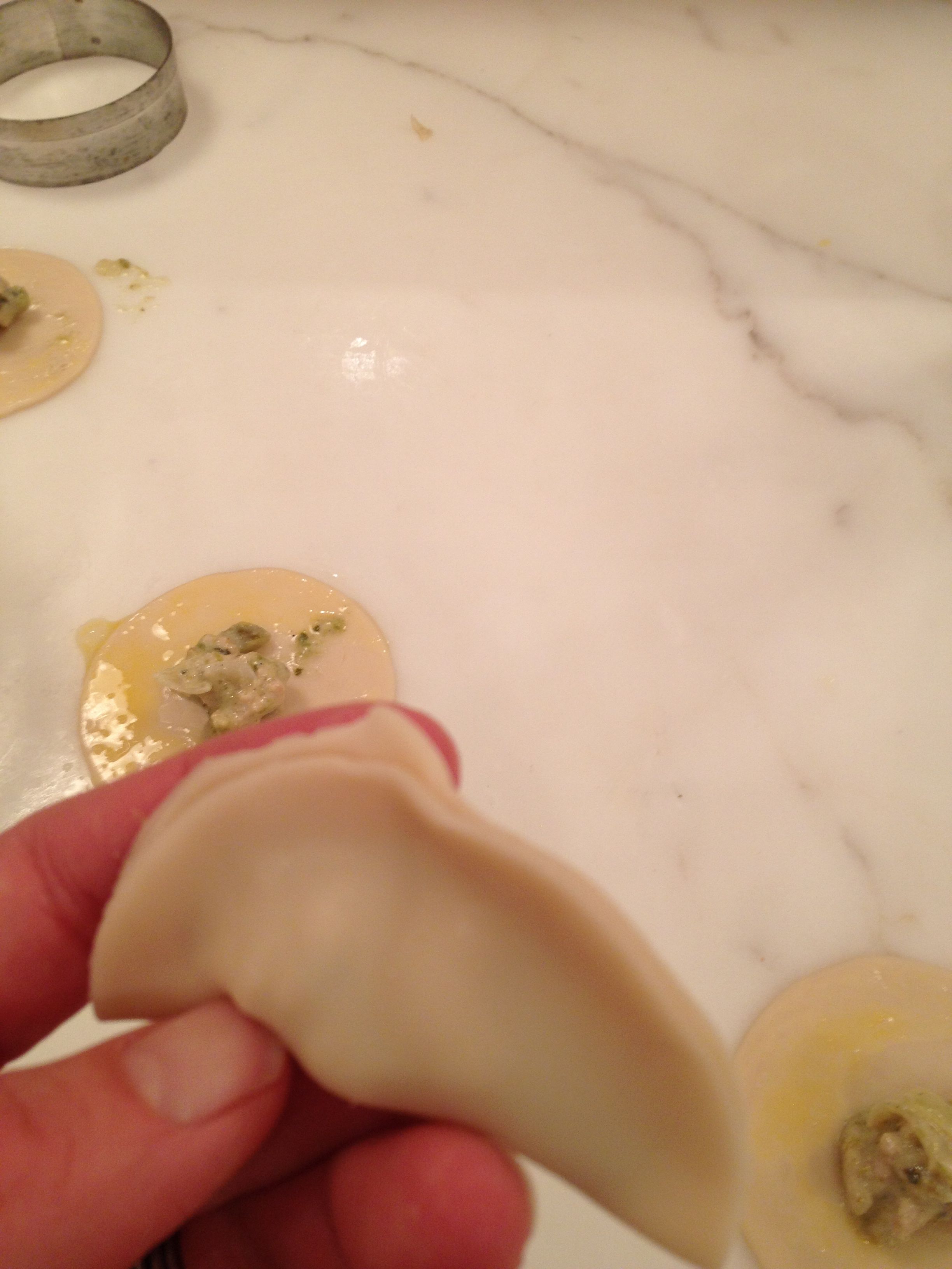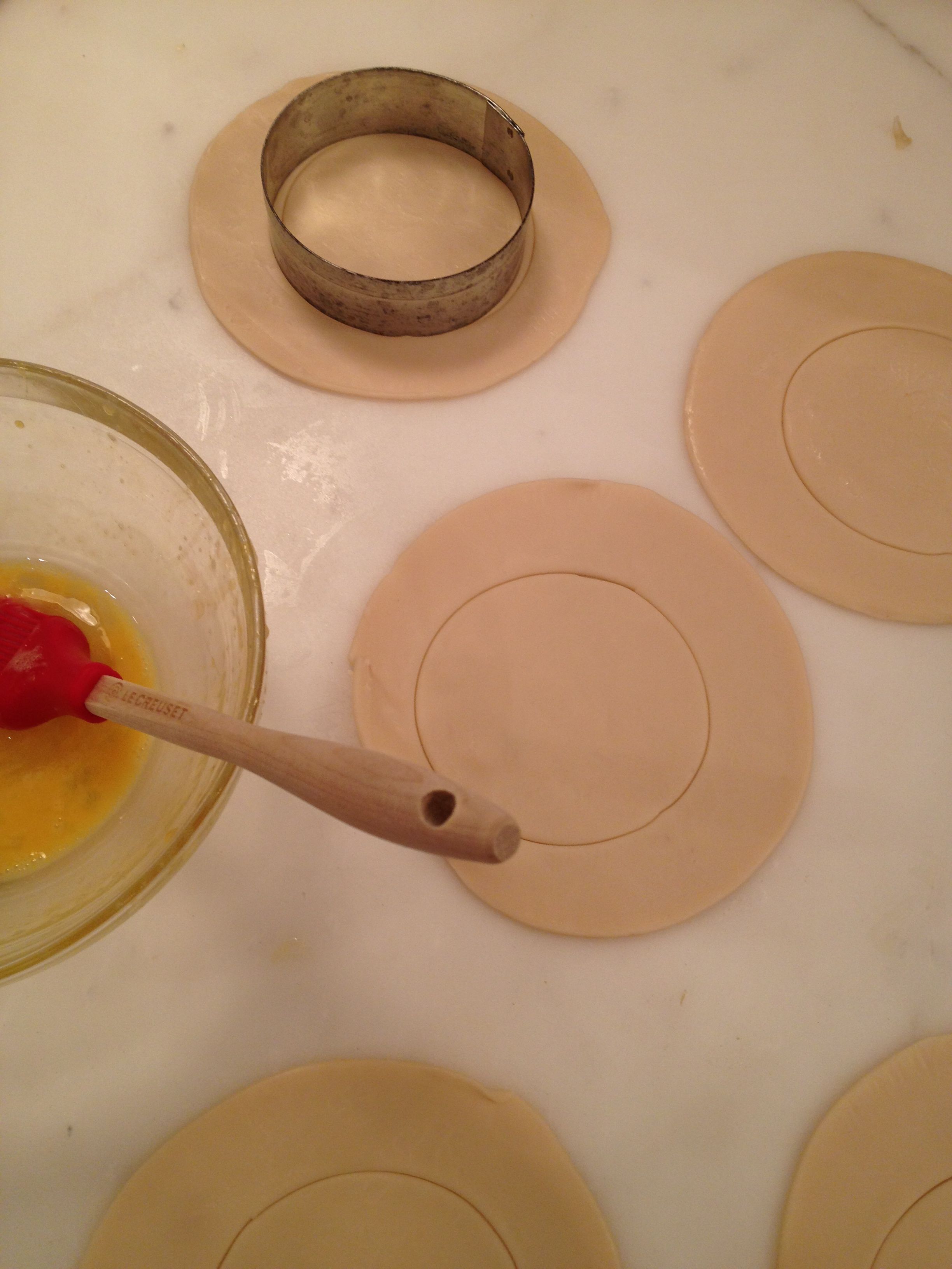 If you’re using cut-out circles, you will seal them using beaten egg and a fork crimp.  Beat one egg and brush along the edges/margins. Fold the circle in half and press edges together to seal. Set onto prepared baking sheet and crimp edges with a fork.
