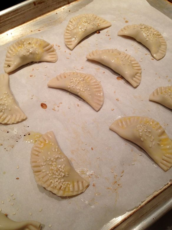 Just before baking, beat 1 egg (or use what was left from sealing ) and brush onto tops of empanadas.  Sprinkle with sesame seeds.