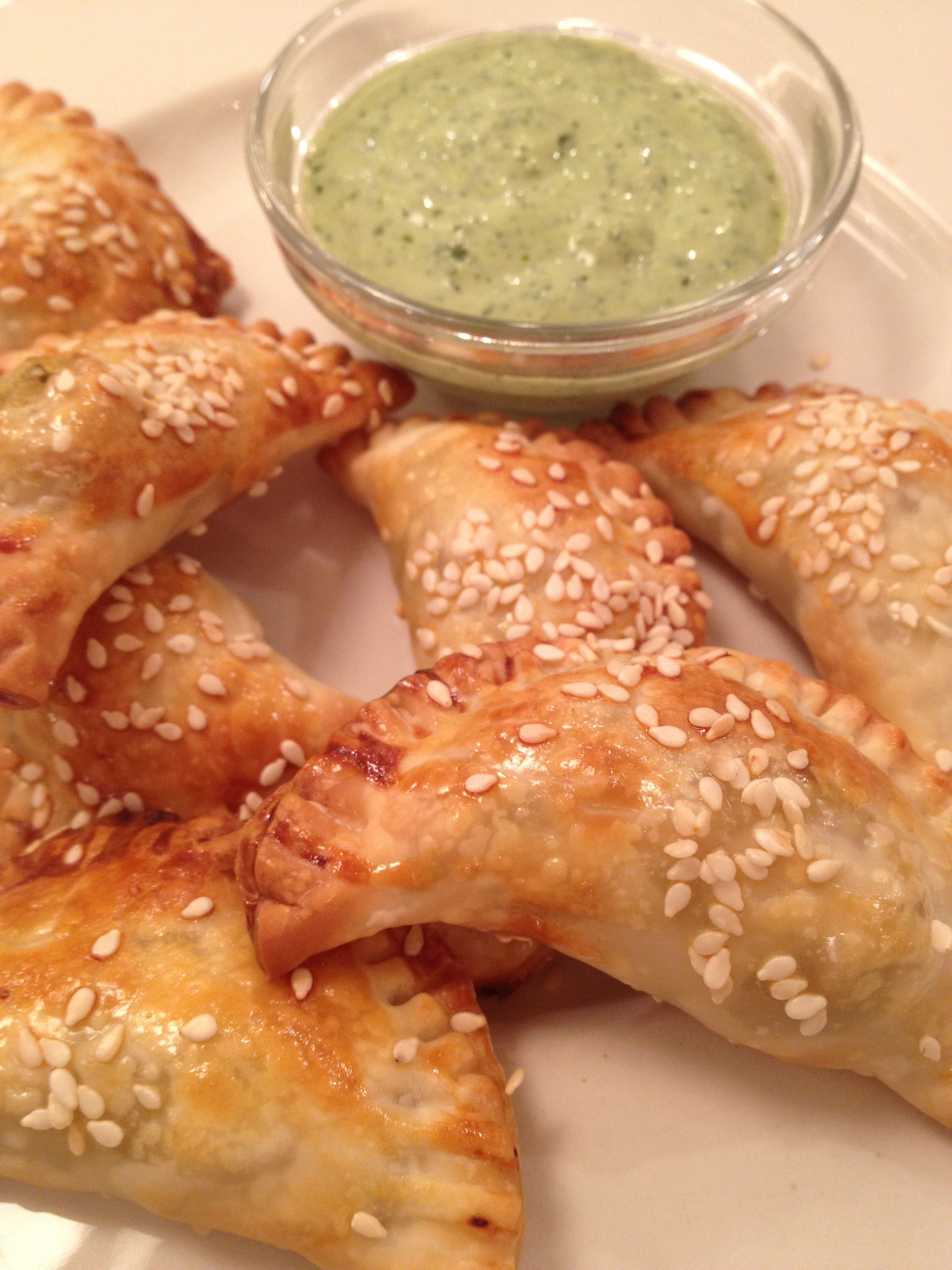 If you can’t find them, you can use frozen puff pastry, pie dough, or this recipe below – which is stretchy and forgiving. The assembly goes fairly quickly, once you get the hang of it. (Just don’t overstuff or you’ll get oozage.) I like to freeze unbaked mini empanadas for almost-instant appetizers – great for any time you have extra Cilantro Lime sauce to use up.  (An almost weekly occurrence around here.)