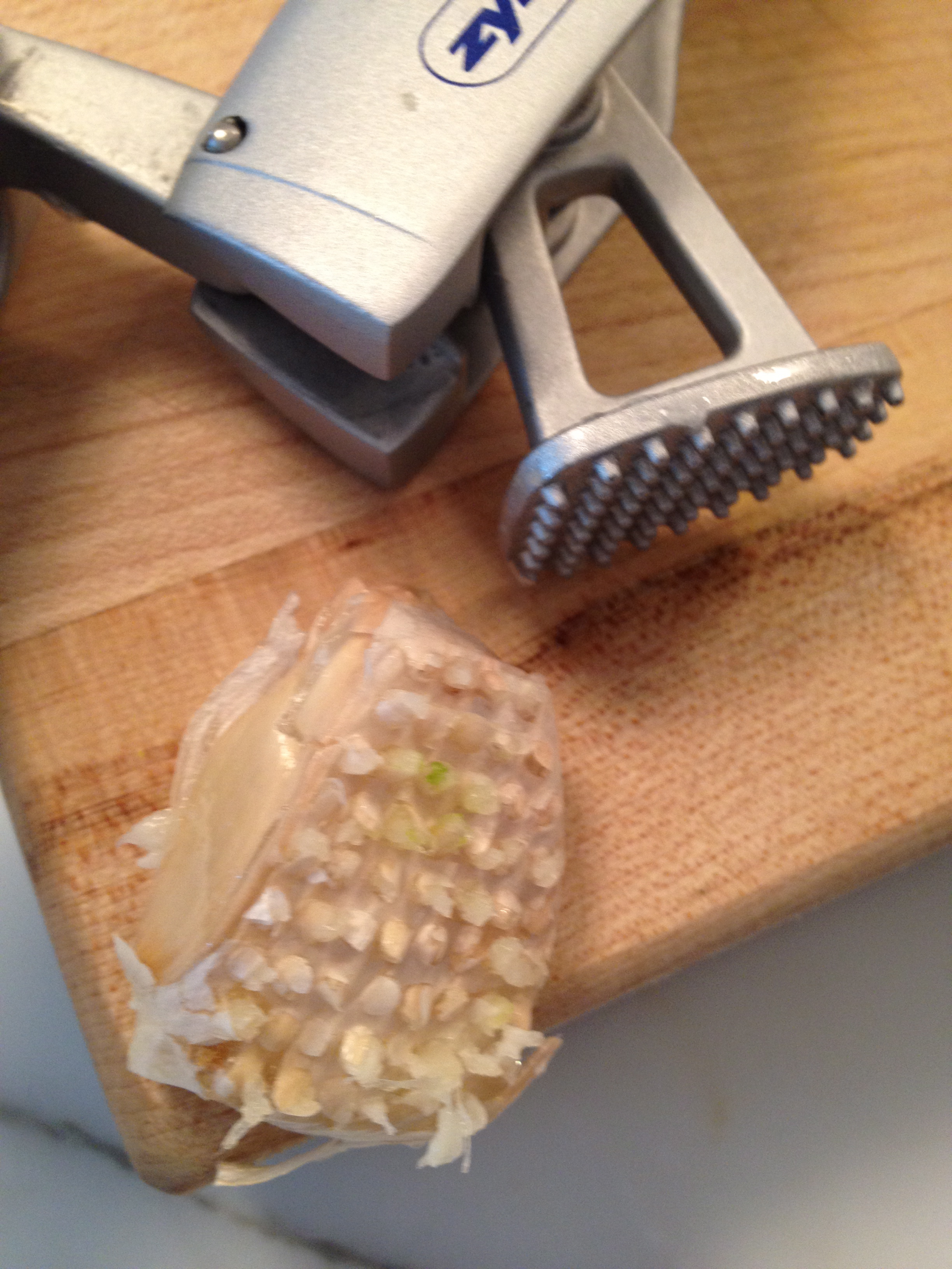 Add garlic and sauté another minute.  (Garlic can taste bitter if burned, so I add it towards the end of the cooking to be safe. Check out this cool garlic pressing trick: if you leave the clove “wrapped” in its papery skin, you can pull it out after pressing and no little bits get stuck in the holes.)