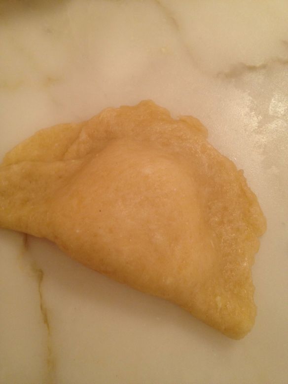 Spoon cooled filling into the centers of the dough circles. As a rough guide, use a heaping teaspoonful (the ice cream eating kind of spoon, not measuring kind) of filling for 2 ½ -3” circles or a heaping tablespoon for 4” circles.  I try to get in as much filling as I can, though I often pay the price with messy-looking empanadas that burst open while baking. Just be sure to leave a ½”+ margin around the entire edge of the circle.