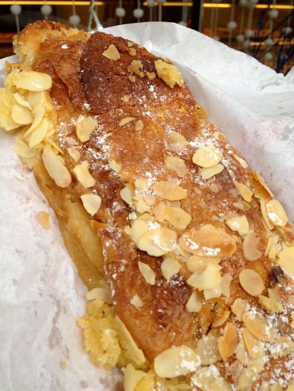 - Stop to get a snack. I recommend the croissant aux amandes (almond croissant) or anything that looks like it has pastry cream and chocolate chips. (This “Chinois” is one example.)