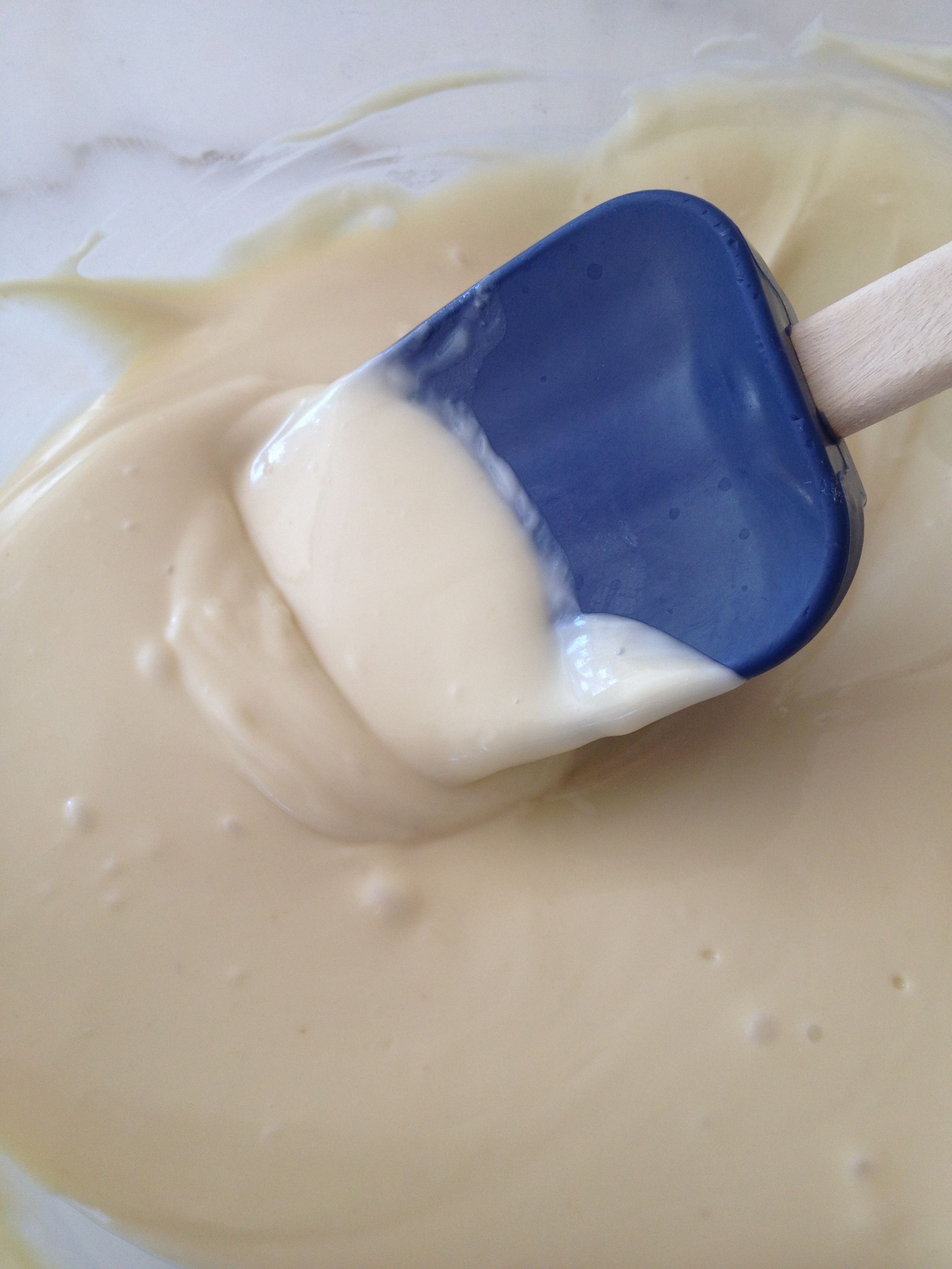 Line 2 baking sheets with parchment paper. In a medium microwaveable bowl, add white chocolate chips and vegetable oil. Microwave on high in 30-second increments, stirring after each, until chips have melted and mixture is smooth. (These Trader Joe’s chips took about 1 minute total.)