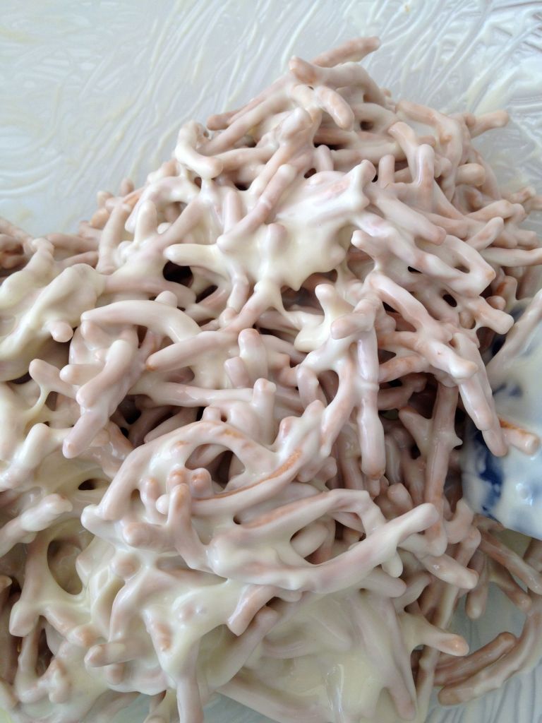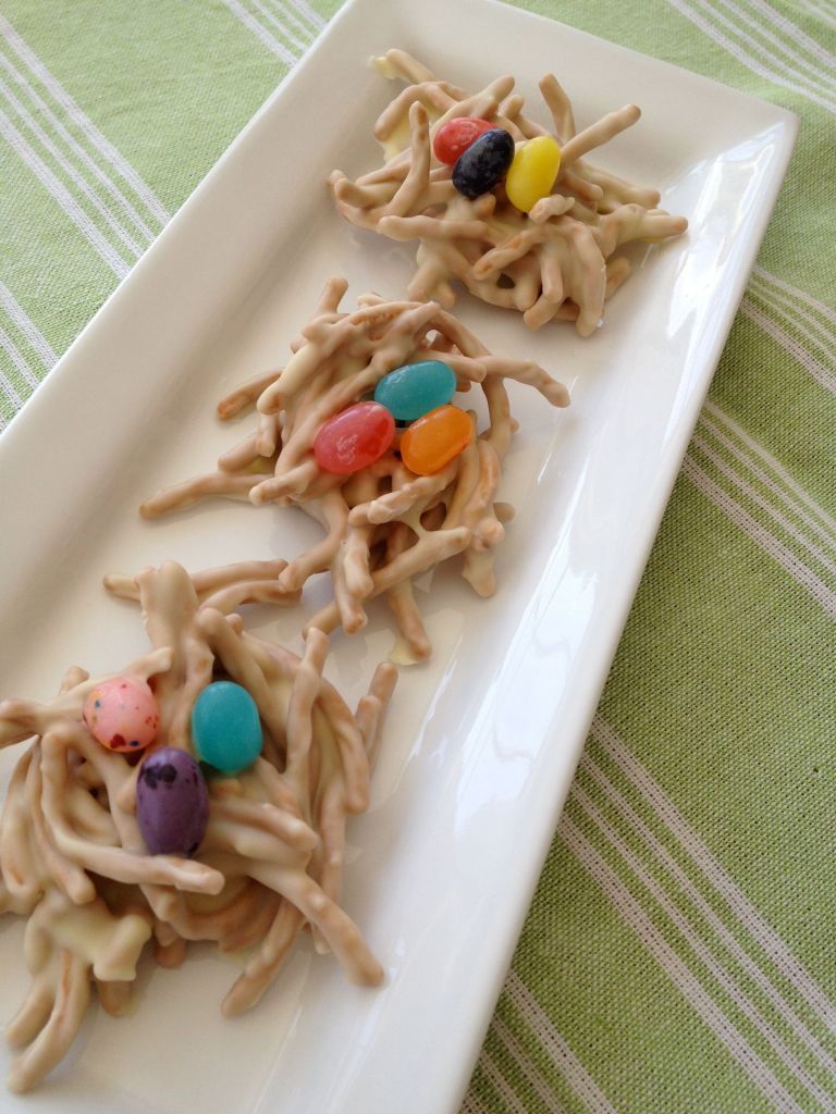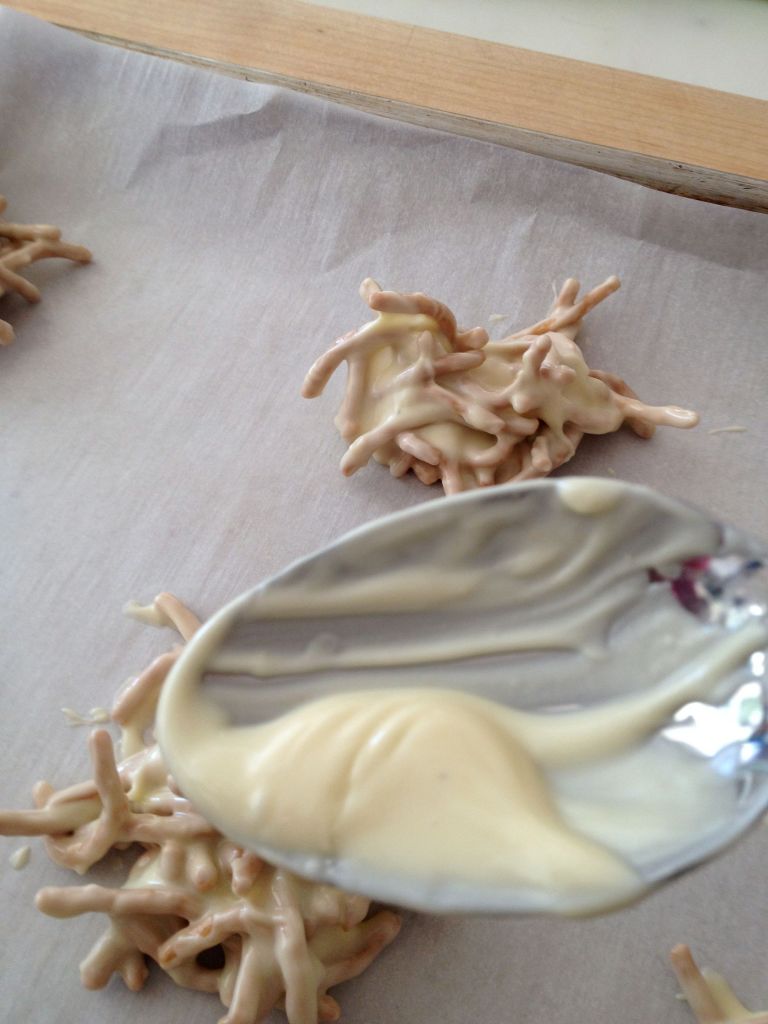 Drop mixture by the spoonful onto parchment-lined baking sheets to form nests. If there is any white chocolate mixture left in the bowl, drop that onto the center of the nests to help the candies adhere.