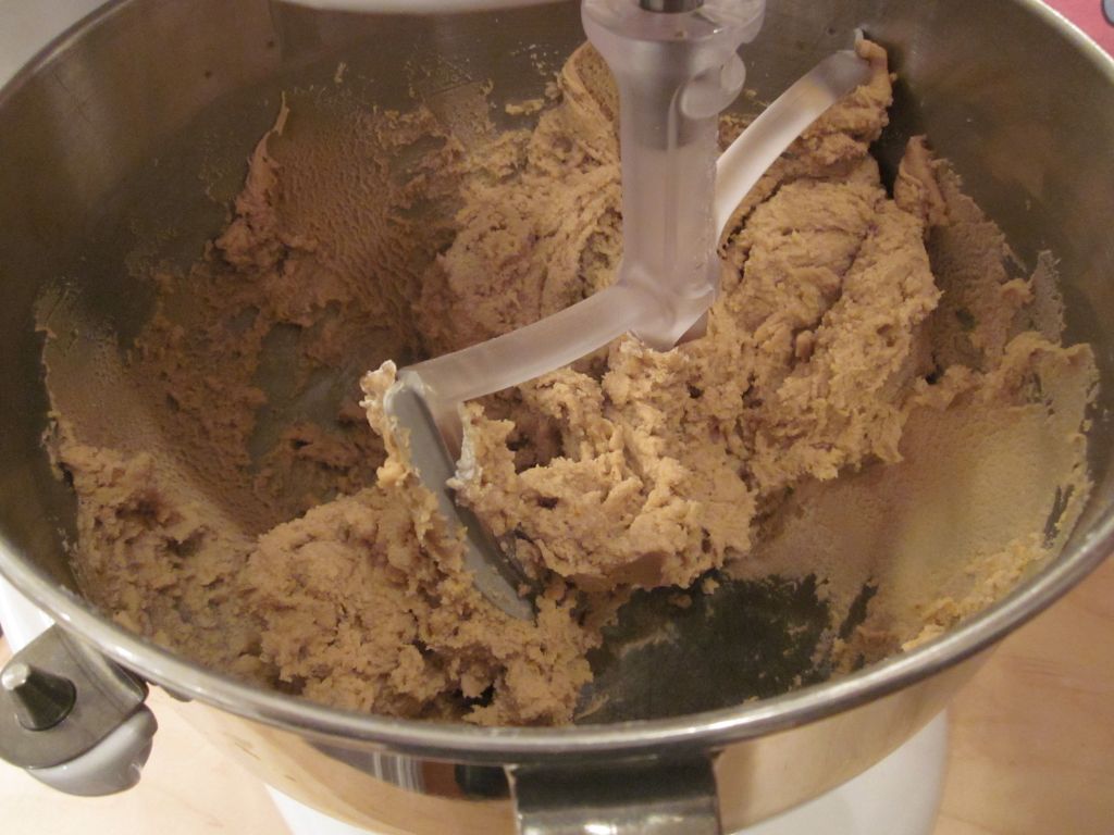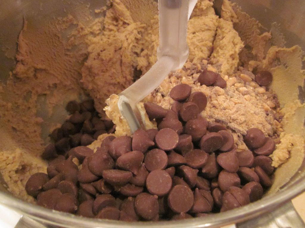 Then add pecans, toffee bits (extra credit for making your own Almond Toffee!) and Hershey’s Mini Kisses. Even the most powerful mixer will groan a little at all this. Finish mixing by hand if necessary.