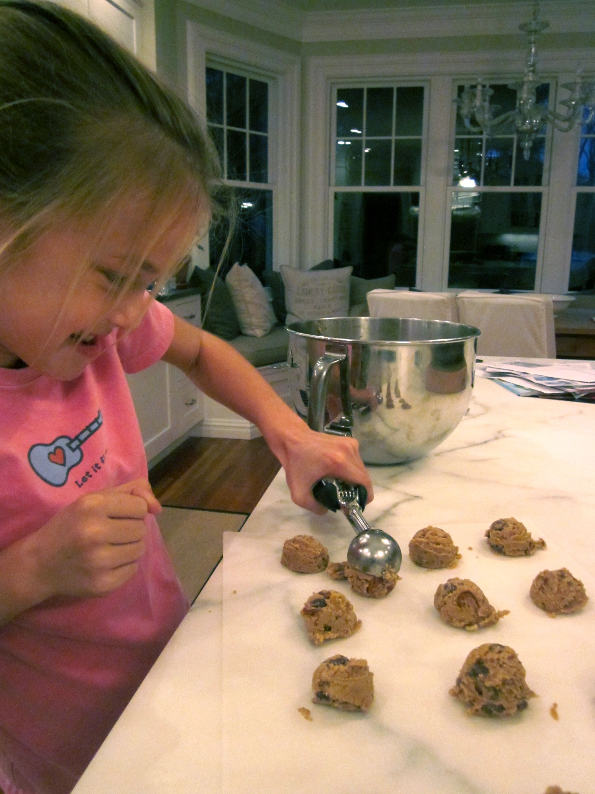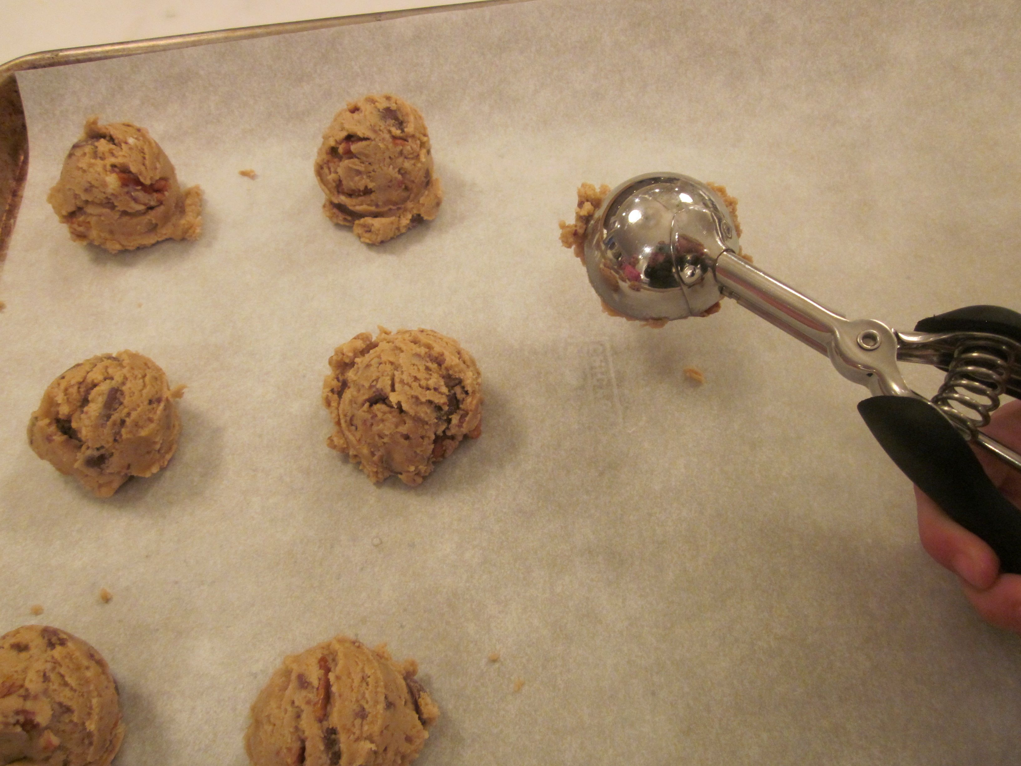 Using a small ice cream scooper or a spoon, form walnut-sized balls. (Gather all inner strength to resist OD’ing on dough.) Place on baking sheet a few inches apart.