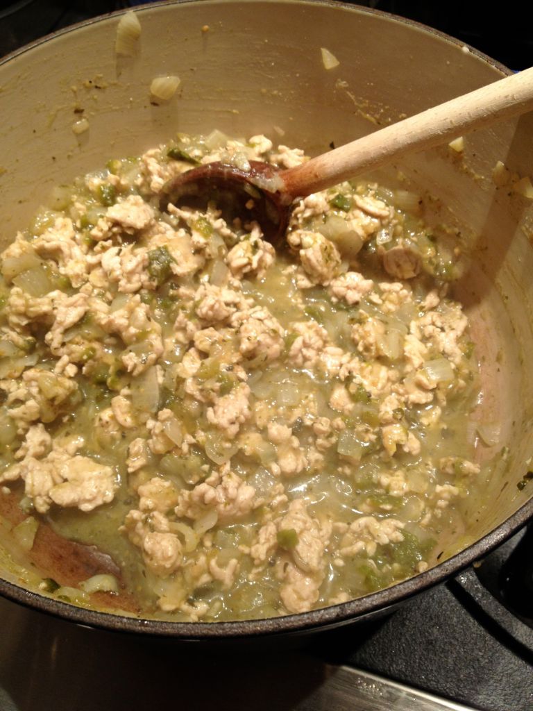 Add turkey, salt and cumin and cook until no longer pink. (Breaking up turkey clumps with a wooden spoon, as if making tacos.)