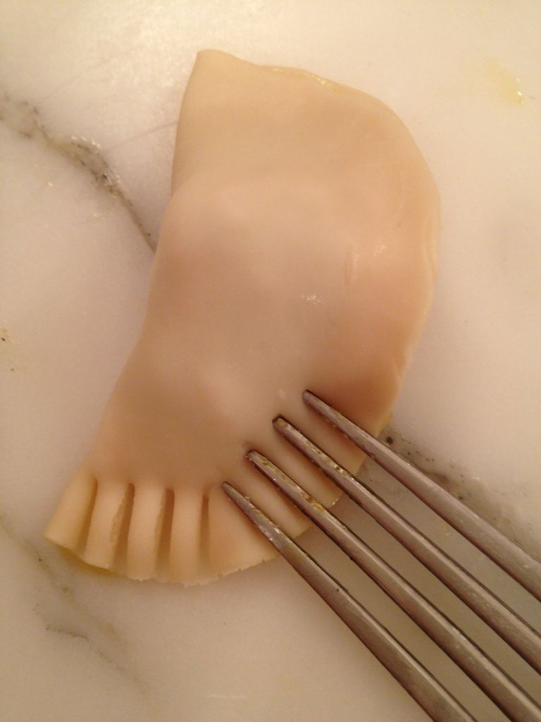 If you’re using cut-out circles, you will seal them using beaten egg and a fork crimp.  Beat one egg and brush along the edges/margins. Fold the circle in half and press edges together to seal. Set onto prepared baking sheet and crimp edges with a fork.