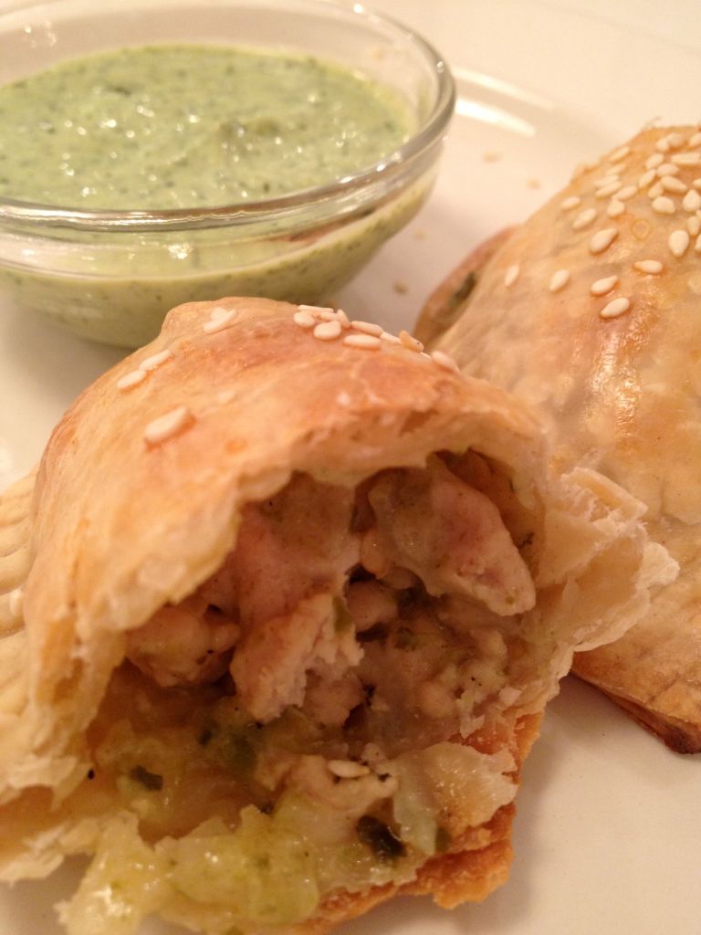 If you can’t find them, you can use frozen puff pastry, pie dough, or this recipe below – which is stretchy and forgiving. The assembly goes fairly quickly, once you get the hang of it. (Just don’t overstuff or you’ll get oozage.) I like to freeze unbaked mini empanadas for almost-instant appetizers – great for any time you have extra Cilantro Lime sauce to use up.  (An almost weekly occurrence around here.)