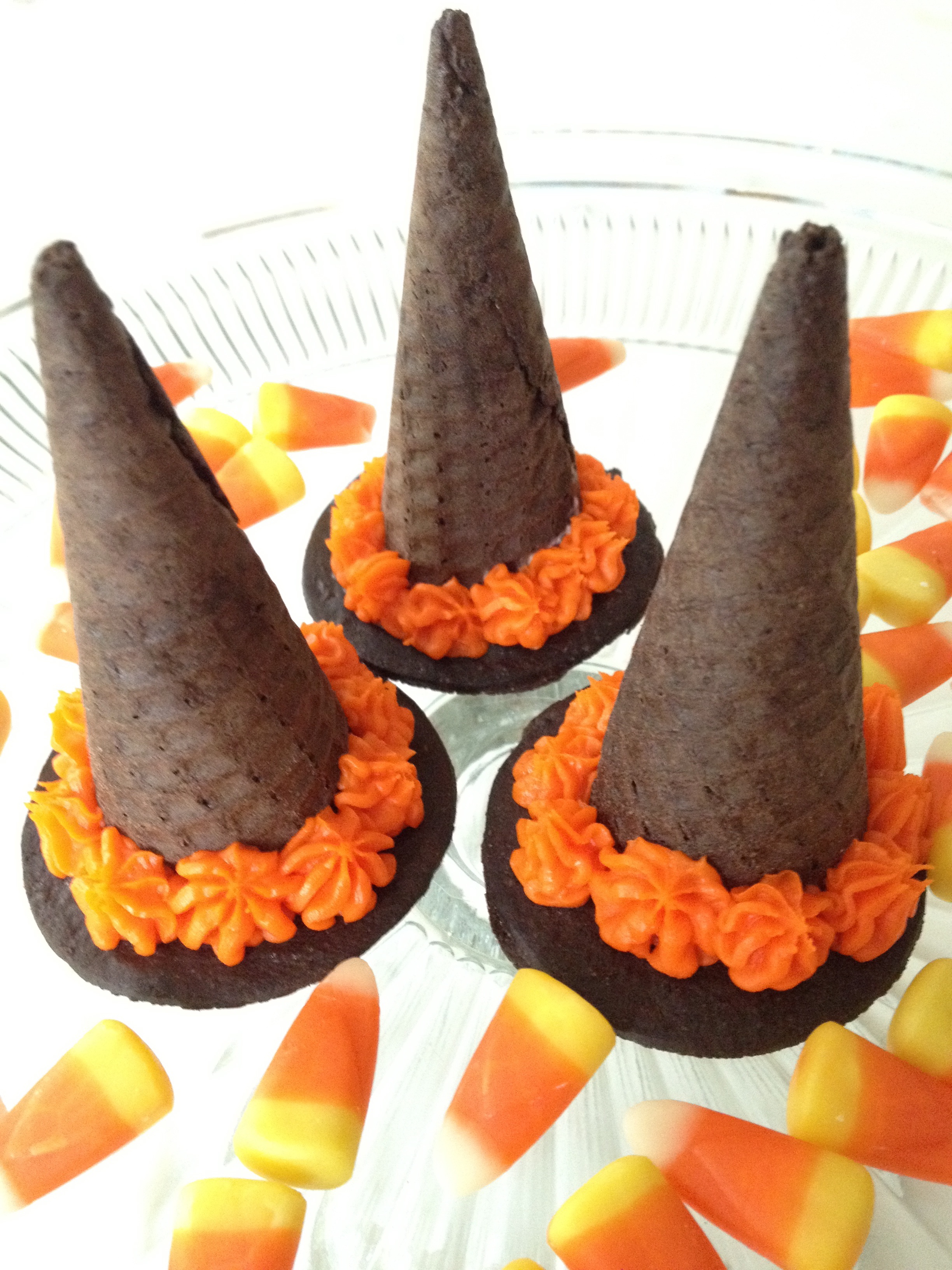 With a few store-bought products and the vanilla ice cream I had at home, I could quickly whip up some ice cream witches’ hats for after school snacks. By cutting down the cones, the portion of ice cream becomes just right for kids (or, ahem, moms).
