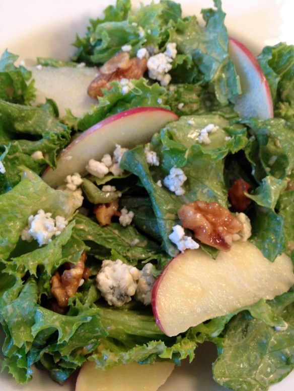 Normally I’d have a lot to say about a salad as beautiful as this. I’d talk about the perfect balance of sweet and tart, tender and crisp. A feast for the eyes as well as the palate. Autumn on a plate. Something old, something new, something borrowed, some cheese blue. And so on. However, I’ve waited until the last minute (once again) to iron and sew on Girl Scout uniform insignia for a meeting tomorrow, and there are way too many dishes piled up in the sink for me to expound upon this lovely salad at the present time. So I’ll be brief: Honeycrisp apples + candied walnuts + blue cheese + lettuce + vinaigrette = a delicious and satisfying fall salad. If only the new “Everyday Mathematics” were this simple! (Partial sums and column addition, anyone?)