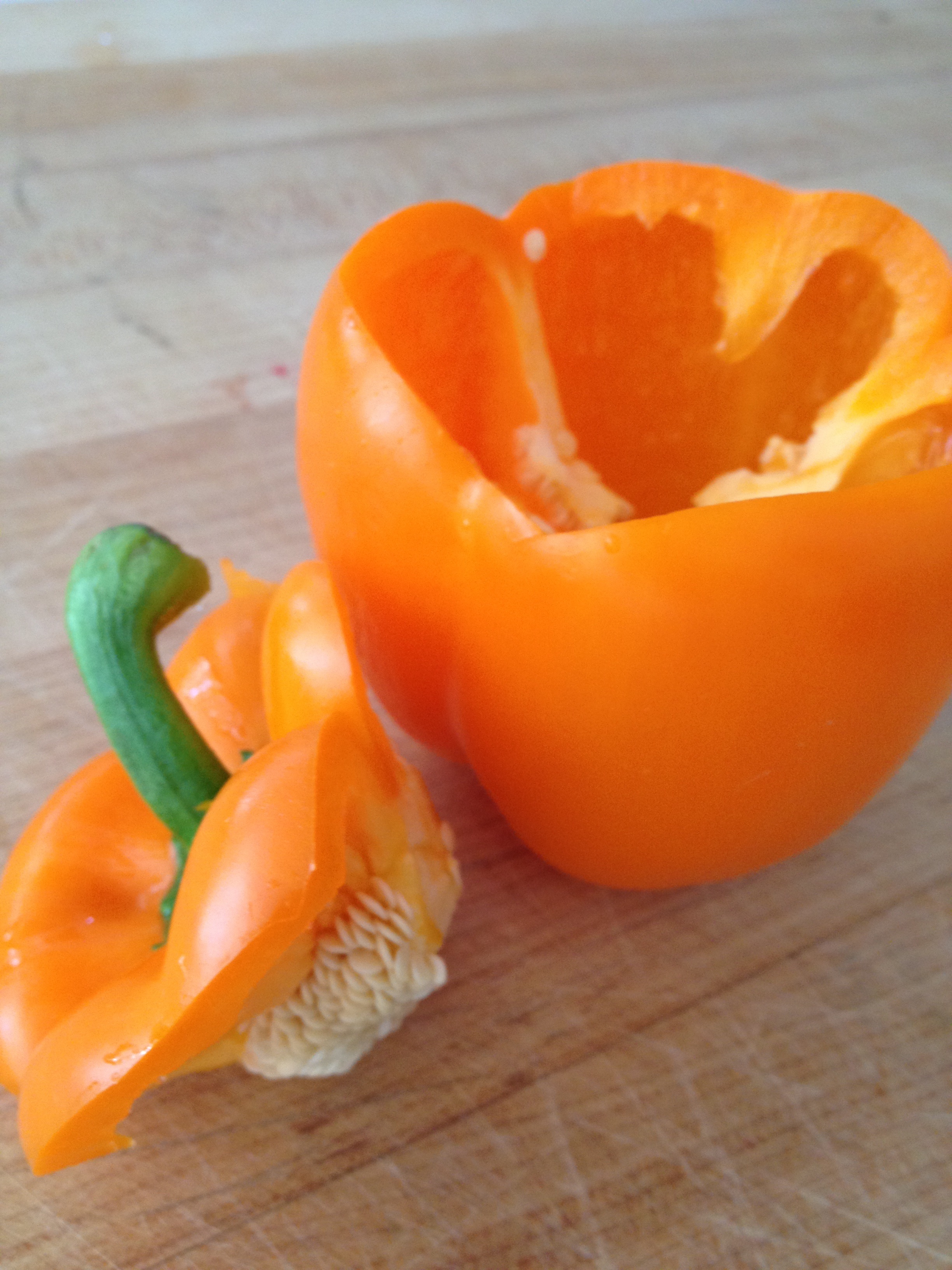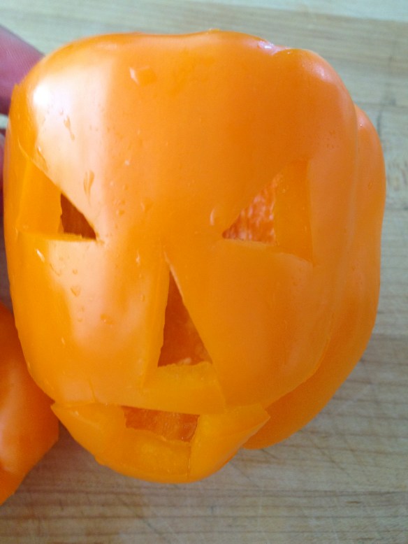 Carve a simple jack-o-lantern face. My nose and mouth were a little too low; try to keep the “face” on the flat part of the pepper, before it curves under. This will keep the filling from oozing out too much.