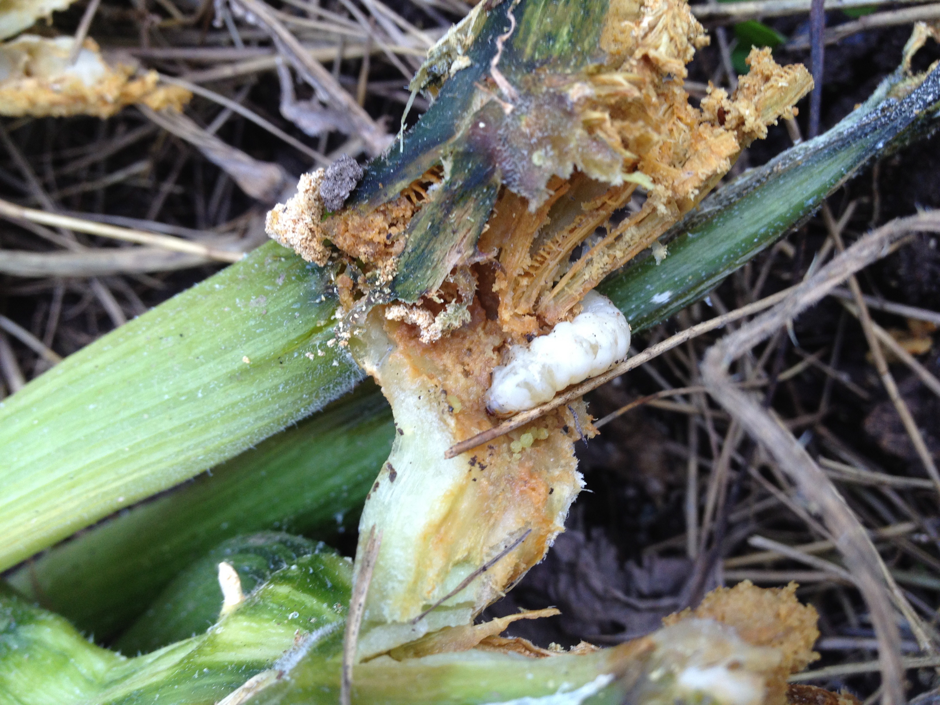 The dreaded squash vine borer! Right before leaving for vacation, my two zucchini plants were thriving and we were harvesting zucchini daily. Thinking I’d whip up a zucchini risotto for dinner the night we got back into town, I headed out to the garden only to find the plants half-dead, with two mini zucchini withering on the vine. The sawdust-like stuff around the base of the plants (frass) was a sure sign that this was the work of the squash vine borer. Immediate surgery would be required to save the plants!